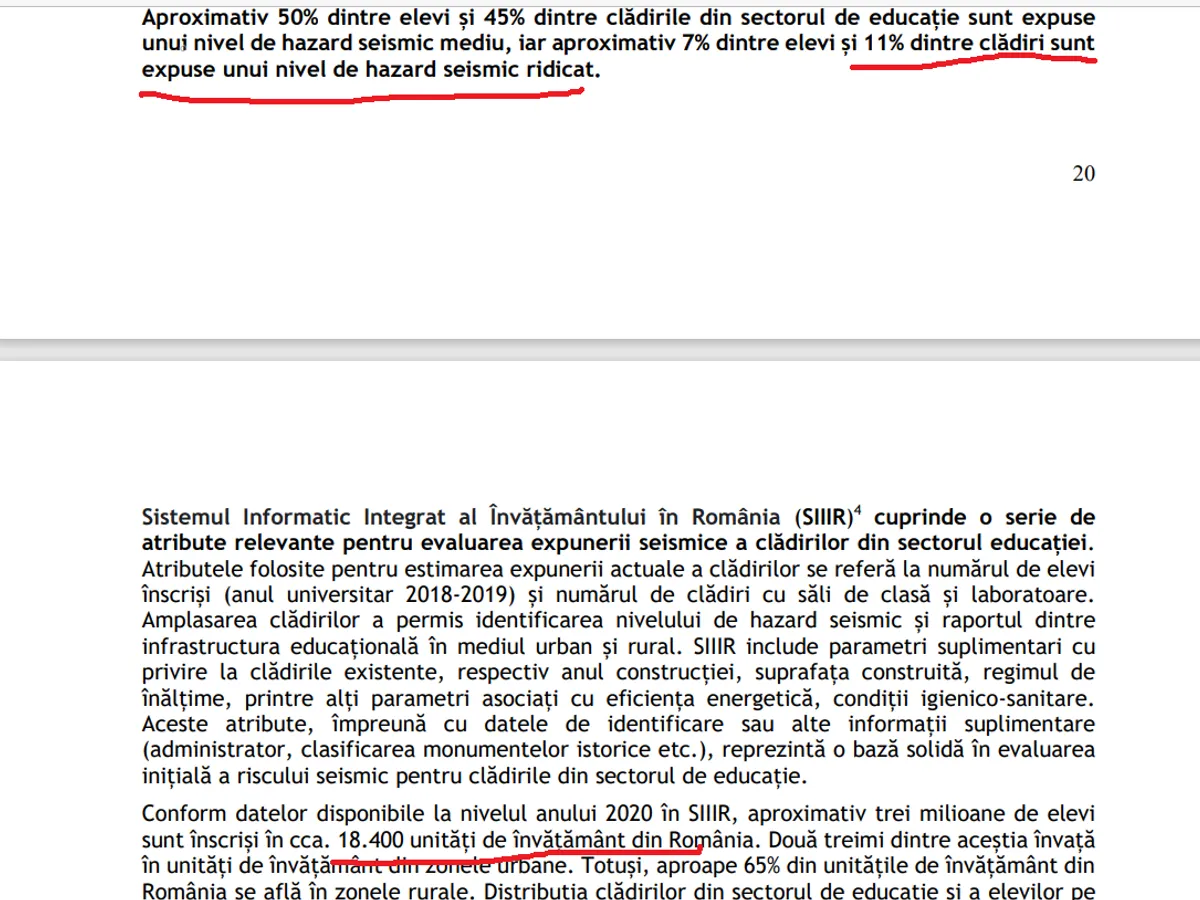 În ceea ce privește numărul clădrilor în care învață elevi, acestea sunt în număr de 18.000 (cel mai probabil sunt calculate numărul clădirilor). 11% din cele 18.000 arată că numărul clădirilor care sunt un pericol pentru copii în caz de cutremur sunt de 1.980.