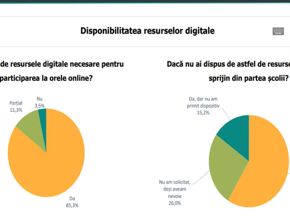 În contextul pandemiei de COVID-19, elevii care nu dispuneau de resursele necesare participării la orele online puteau solicita unității de învățământ un dispozitiv care să le faciliteze participarea la ore. Astfel, 85,3% dintre elevii respondenți au spus că încă de la începutul anului școlar au dispus de resurse digitale, 11,3% au dispus parțial de aceste resurse, iar 3,5% declară că nu au dispus deloc de resurse.