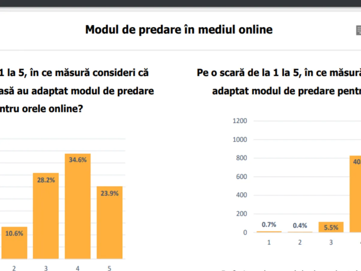 2,7% dintre elevi nu consideră că profesorii au adaptat modul de predare la cerințele învățământului online, 10,6% spun că profesorii au adaptat într-o mică măsură, 28,2% consideră că aceștia că au adaptat într-o măsură acceptabilă, 34,6% declară că au adaptat în mare măsură și 23,9% afirmă că profesorii au adaptat modul de predare în totalitate.