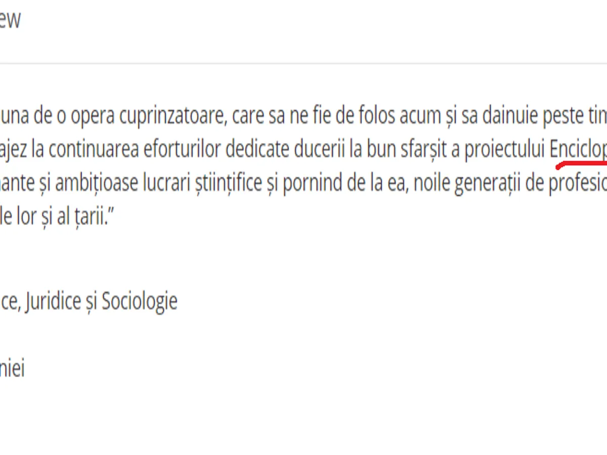 Prezentarea Enciclopediei este semnată de „Academician Mugur ISARESCU Președintele Secției de Științe Economice, Juridice și Sociologie a Academiei Romane Guvernatorul Bancii Naționale a Romaniei”.