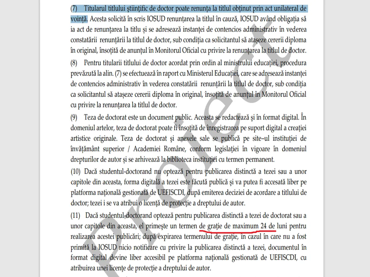 „(7) Titularul titlului ştiinţific de doctor poate renunța la titlul obținut prin act unilateral de voință. Acesta solicită în scris IOSUD renunţarea la titlul în cauză, IOSUD având obligația să ia act de renunţarea la titlu și se adresează instanței de contencios administrativ în vederea constatării renunțării la titlul de doctor, sub condiția ca solicitantul să atașeze cererii diploma în original, însoțită de anunțul în Monitorul Oficial cu privire la renunțarea la titlul de doctor.”
