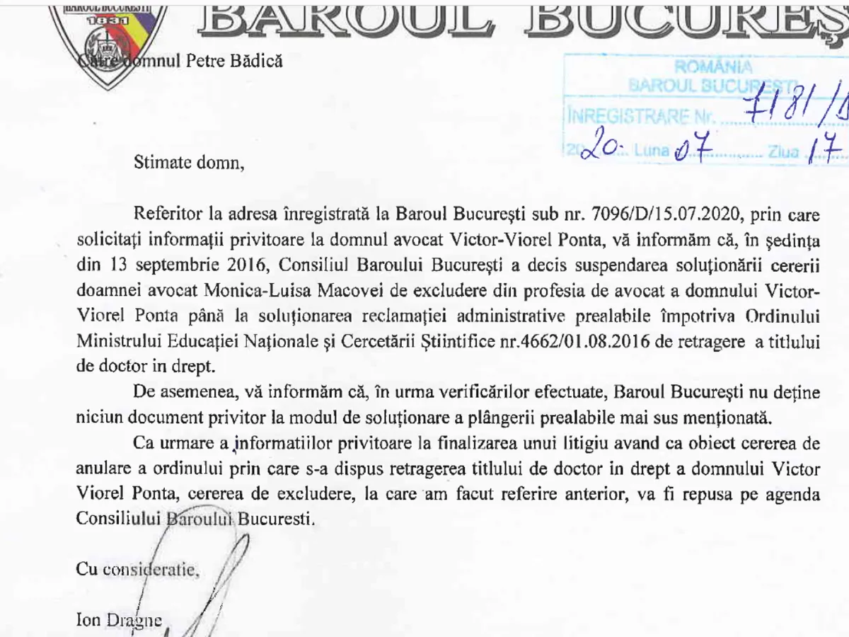 „Referitor la adresa din 15 iulie 2020 prin care ne solicitați informații referitoare la domnul avocat Victor-Viorel Ponta vă informăm că, în ședința din 13 septembrie 2016, Consiliul Baroului București a decis suspendarea soluționării cererii doamnei avocat Monica Macovei de excludere din profesia de avocat a domnului Victor Ponta până la soluționarea reclamației adminsitrative prealabile împotriva Ordinului Ministrului Educației din 1 ianuarie 2016 de retragere a titlului de doctor în drept.