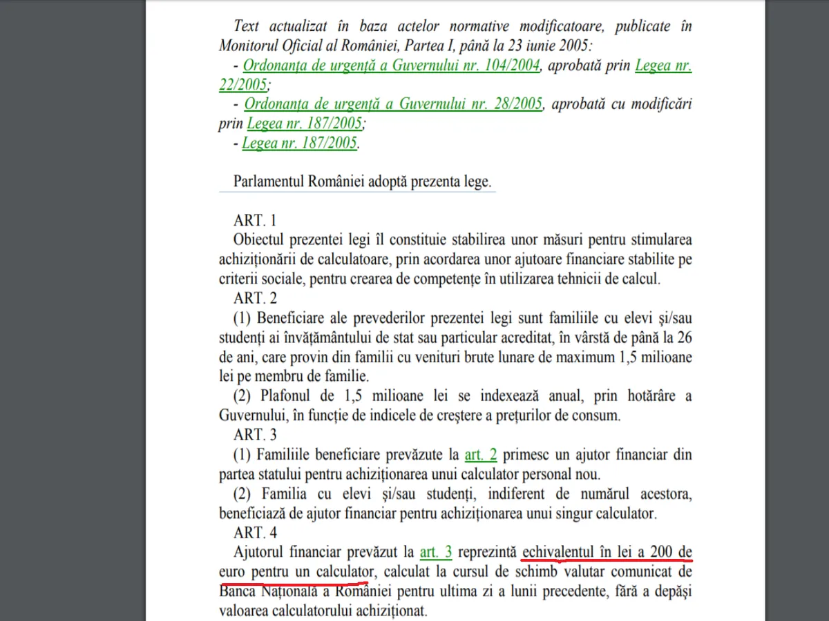 Atunci a apărut Legea Nr. 269 din 16 iunie 2004 privind acordarea unui ajutor financiar în vederea stimulării achiziționării de calculatoare.
