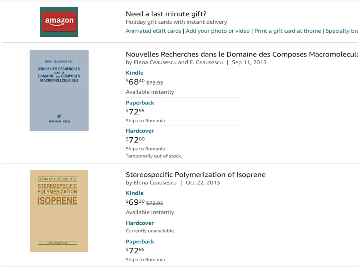 Opera științifică, apărută sub numele Elenei Ceaușescu, poate fi cumpărată și azi de pe Amazon. „Nouvelles Recherches dans le Domaine des Composes Macromoleculaires” costă 70 de dolari, în timp ce „Stereospecific Polymerization of Isoprene” costă 72 de doalri și poate fi cumpărată și citită în format kindle.