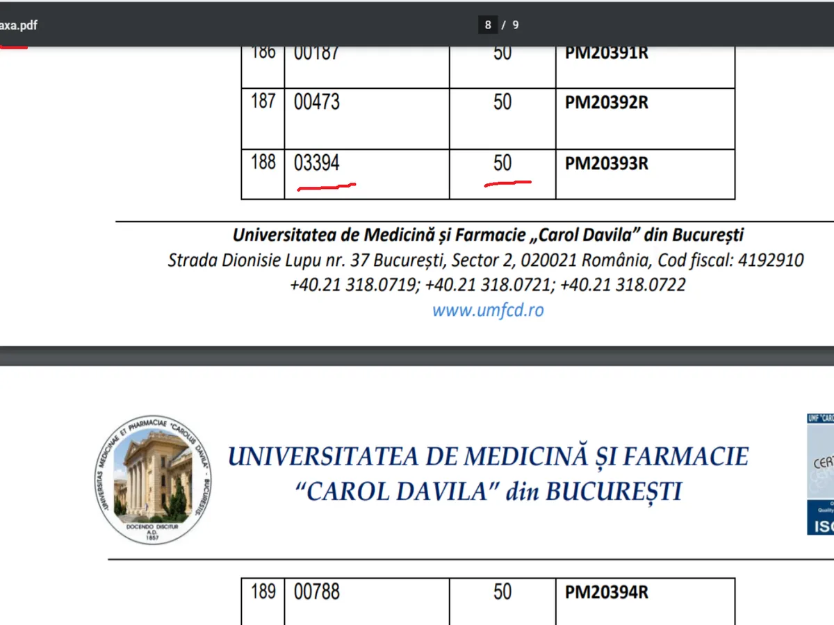 Același elev, cu codul 03394 și nota 5 la admitere, eligibil să fie primit la Facultatea de Medicină după ce a plătit taxa de 6.000 euro: