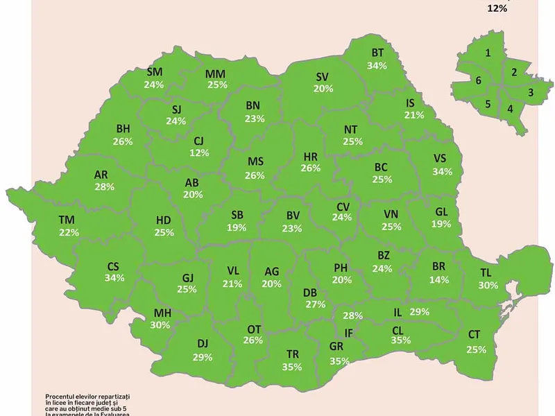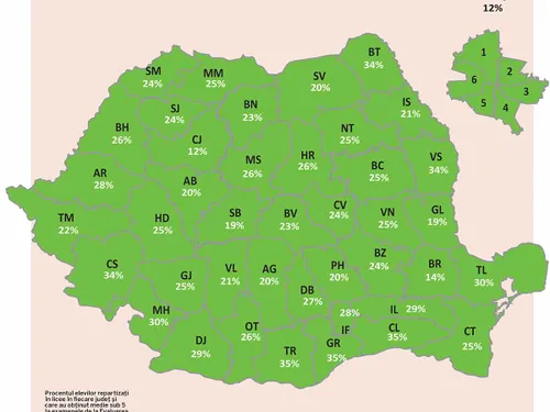 Există județe unde aproape o treime dintre elevi nu au luat medie de trecere la examenele de matematică și de română: Teleorman, Caraș-Severin, Girgiu și Călărași – 35%, Vaslui – 34%, Mehedinți – 30%, Ialomița, Dolj – 29%.