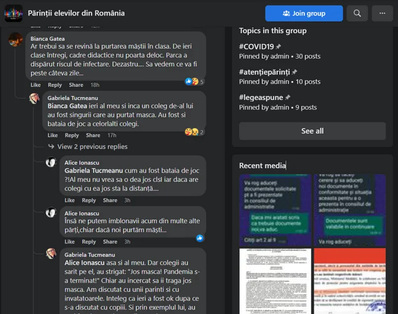 „Ar trebui sa se revină la purtarea măștii în clasa. Clase întregi, cadre didactice nu poarta deloc. Parca a dispărut riscul de infectare. Dezastru.... Sa vedem ce va fi peste câteva zile...”, a postat, de pildă, și Bianca Gatea în același grup de Facebook.
