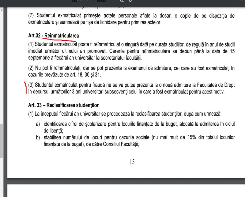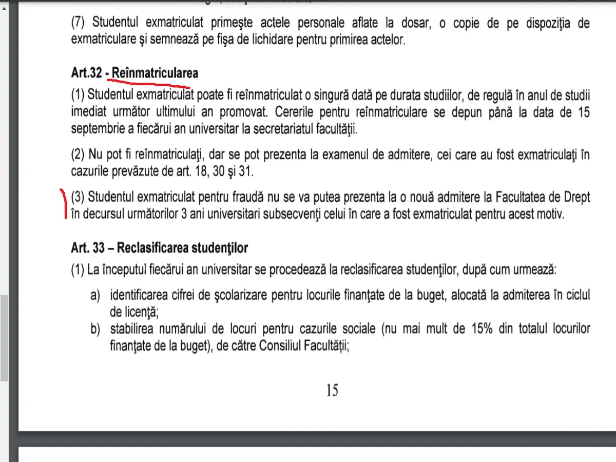 Regulamentul Facultății de Drept menționează exmatricularea