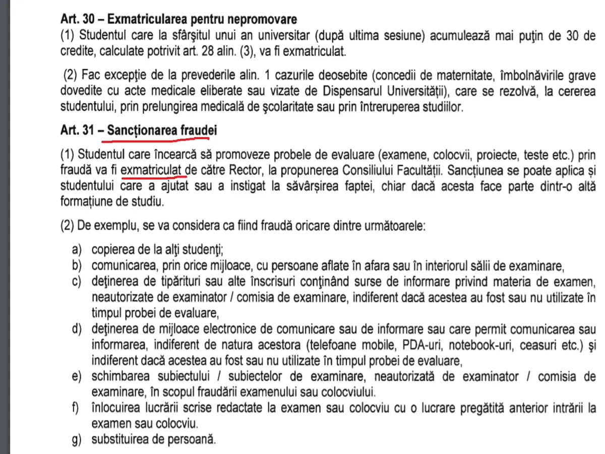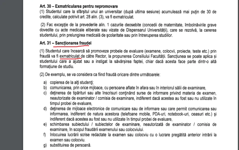 Articolul 31. Studentul care încearcă să promoveze probele de evaluare (examene etc) prin fraudă va fi exmatriculat.
