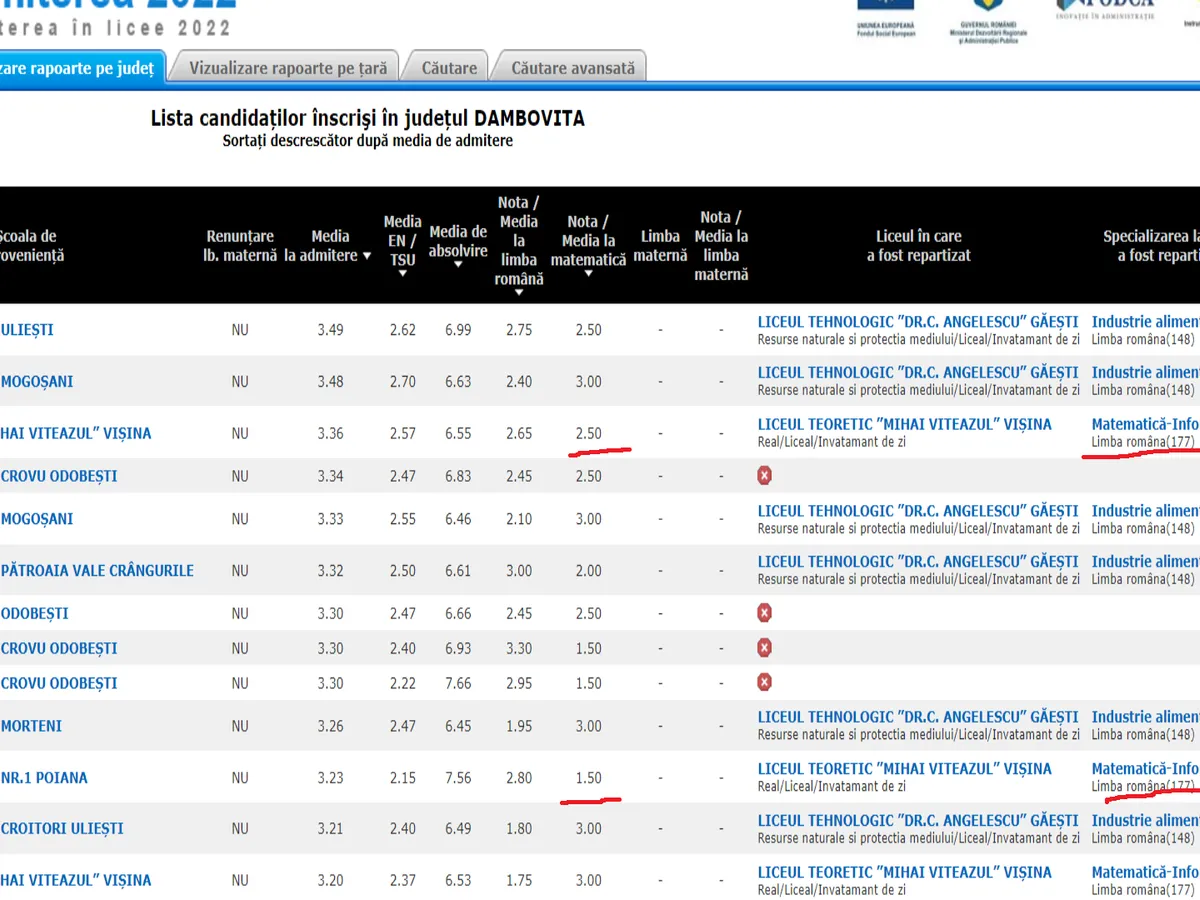 Spre exemplu, la Dâmbovița, un elev care a obținut nota 2,5 la matematică la Evaluare Națională a intrat în clasa de matematică-informatică de la Liceul „Mihai Viteazu” din Vișina. La același liceu s-a intrat și cu 1,5 la matematică la aceeași specializare.