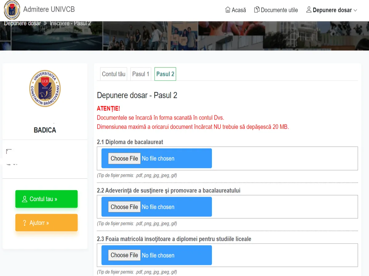 Trebuie să încărcați diploma de bacalaureat, adeverința de susținere a bacalaureatului și foaia matricolă însoțitoare a studiilor liceale.