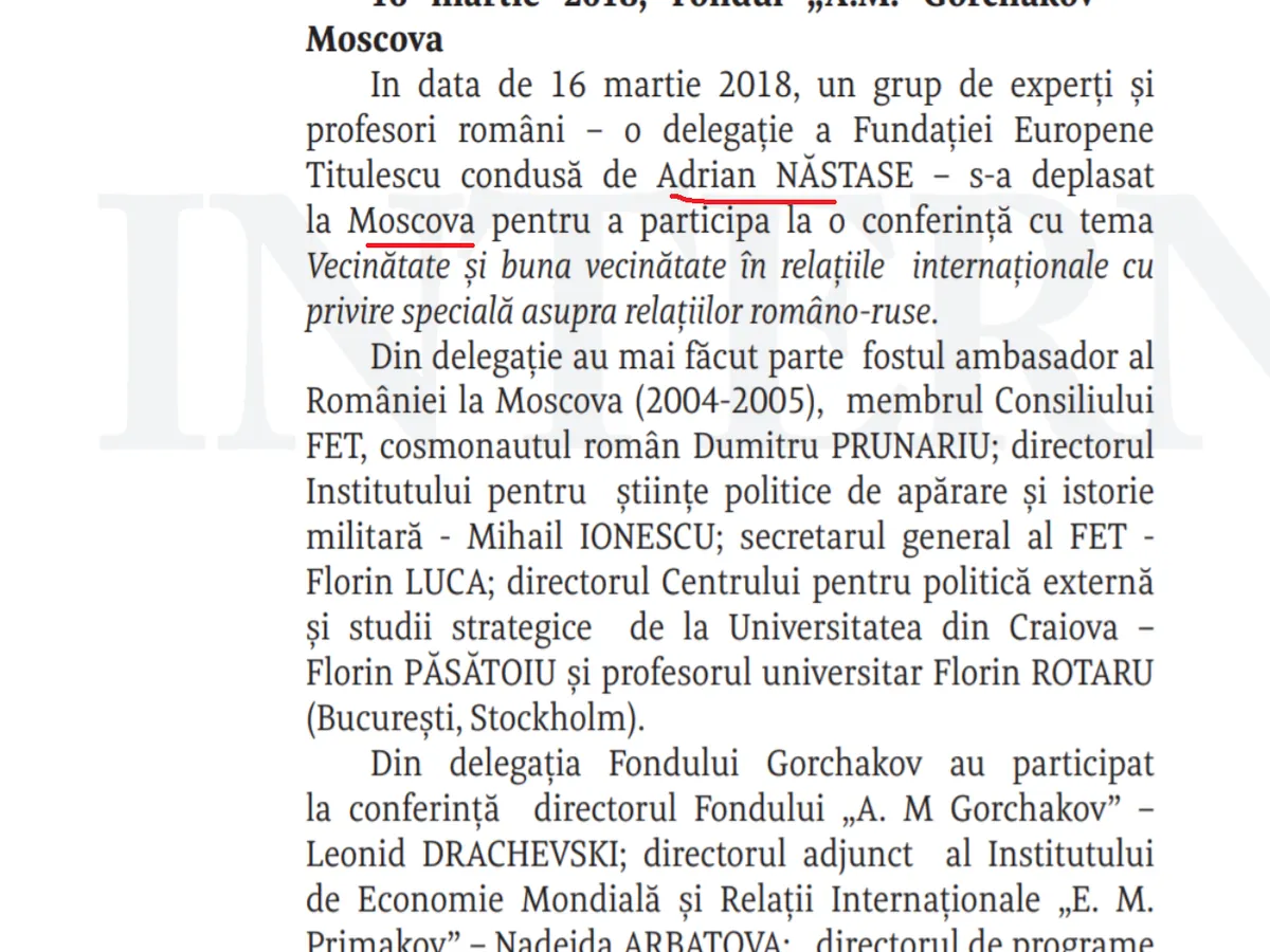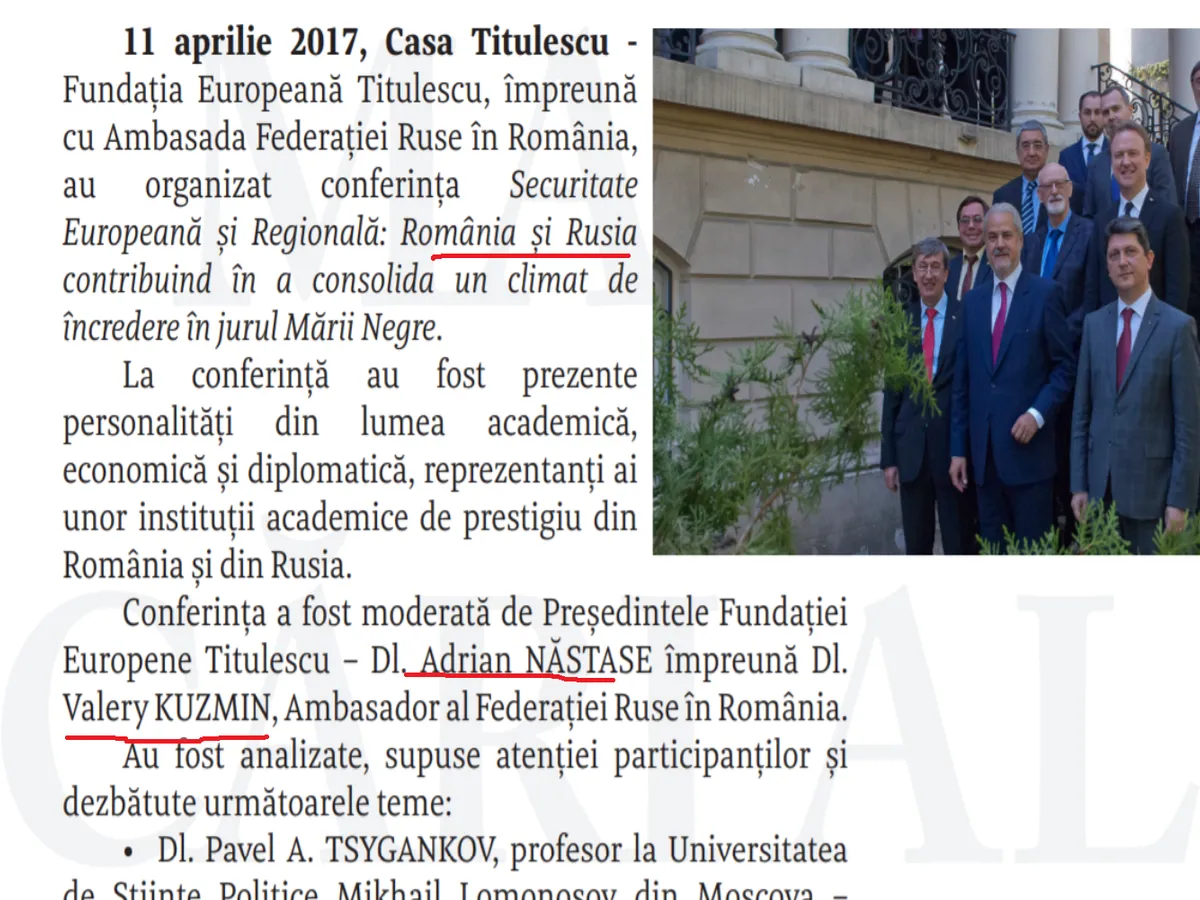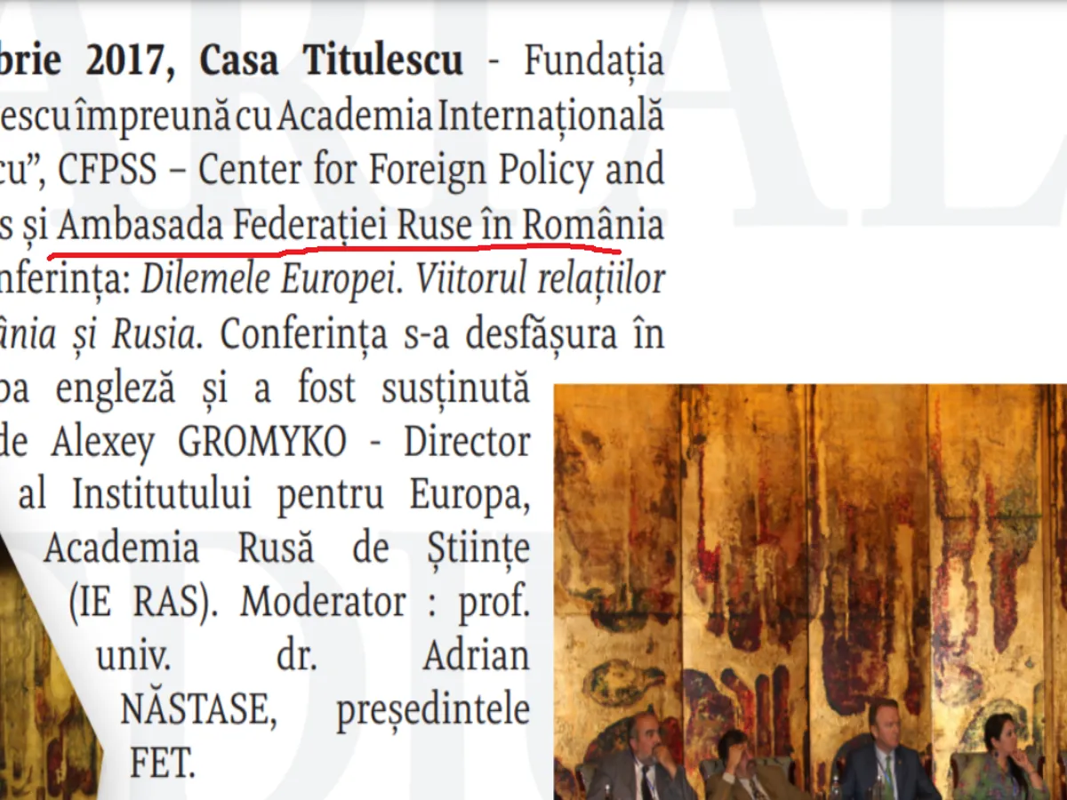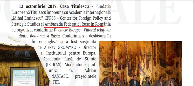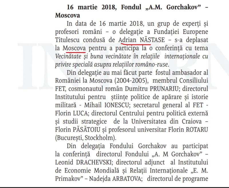 „In data de 16 martie 2018, un grup de experți și profesori români – o delegație a Fundației Europene Titulescu condusă de Adrian Năstase s-a deplasat la Mosova pentru a participa la o conferință cu tema „buna vecinătate în relațiile internaționale cu privire specială asupra relațiilor româno-ruse….”