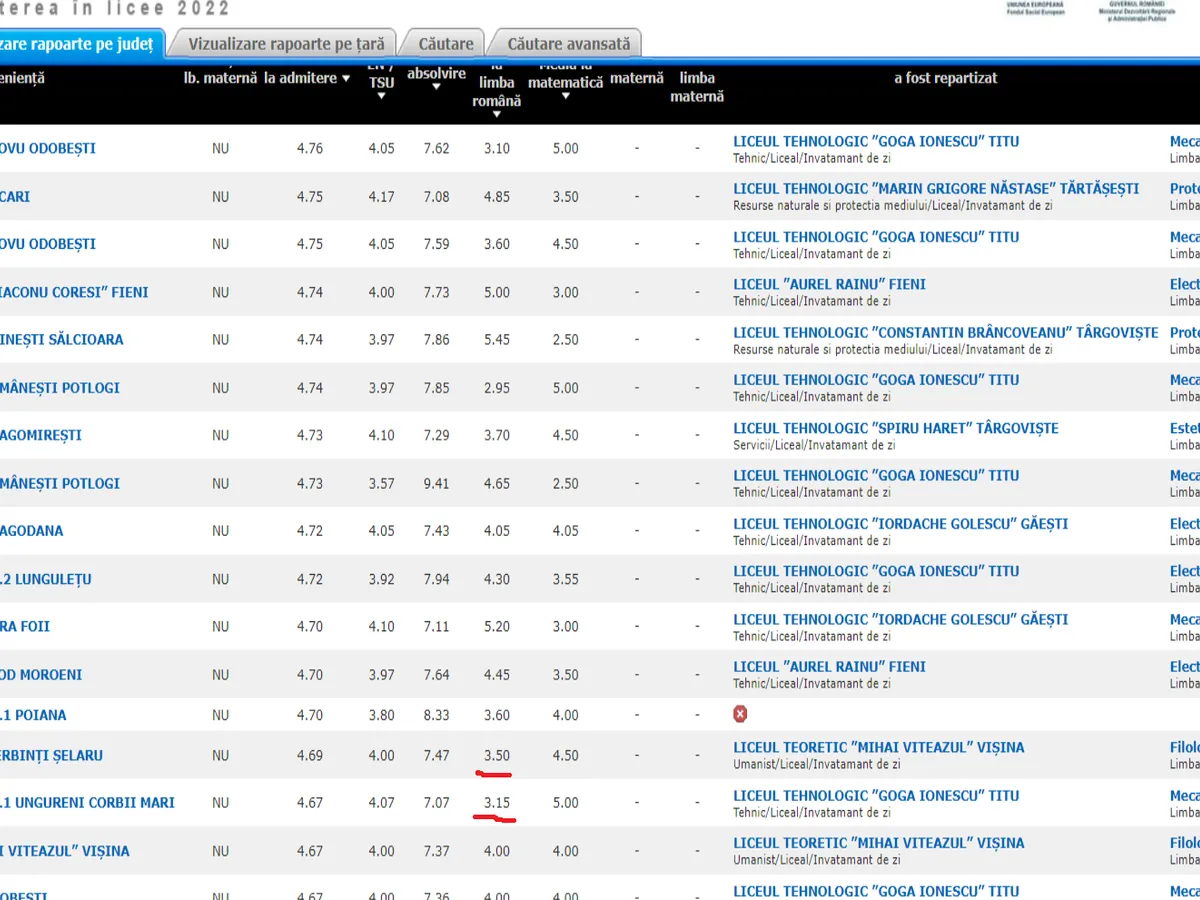 Doi elevi au fost admiși la Liceul Mihai Viteazu Vișina din Dâmbovița, deși au luat la examenul de română de la Evaluarea națională note de 3,5 și 4. În ambele cazuri, media de absolvire a claselor V - VIII a fost de peste 7.