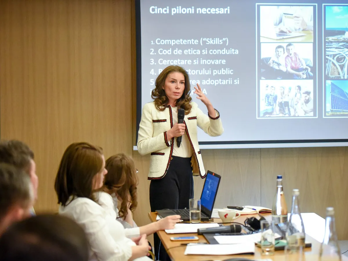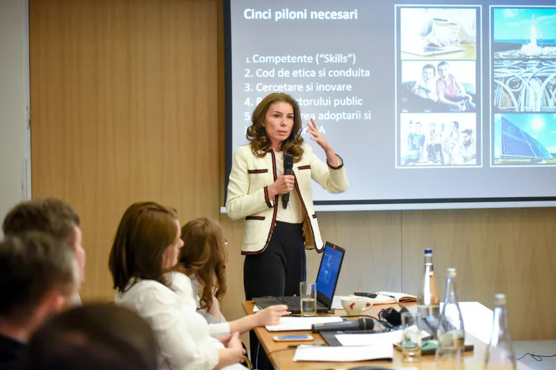 Bazat pe experiența avută, credem că sunt cinci piloni necesari pentru dezvoltarea acestui domeniu. S-a vorbit, deja, despre competență, codul de etică, cercetare și inovare. Noi am adăuga: cum se transformă sectorul public folosind inteligența artificială. Numărul cinci este promovarea adoptării și implementării inteligenței artificiale. În ceea ce privește codul de etică și conduită, nu doar guvernul, dar și companiile trebuie să îl urmeze. Noi am dezvoltat un cod de etică în dezvoltarea inteligenței artificiale, avem și un board de etică”.