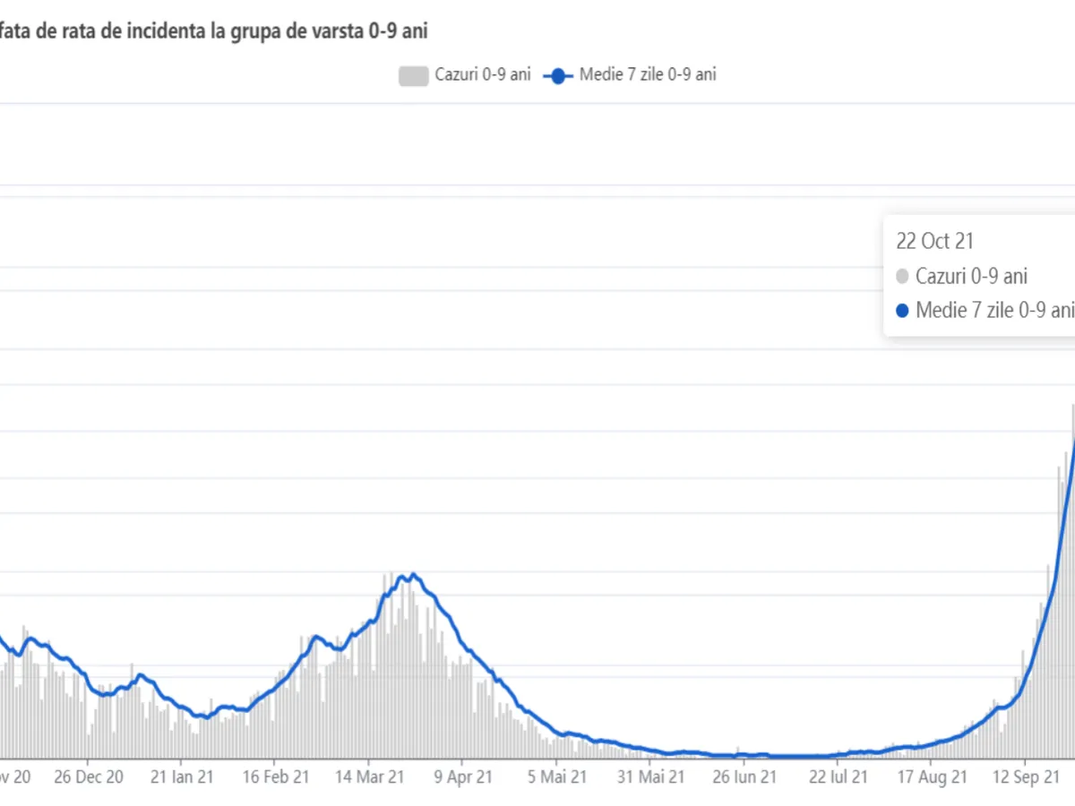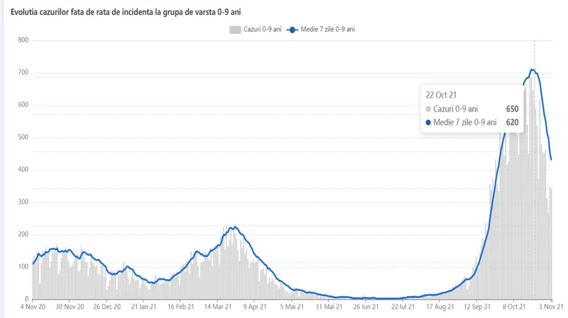 Pe 22 octombrie au fost 650 de cazuri de copii sub 9 ani infectați cu COVID. Pe 3 noiembrie sunt 376 de copii sub 9 ani infectați cu COVID. Scăderea este de 42%.