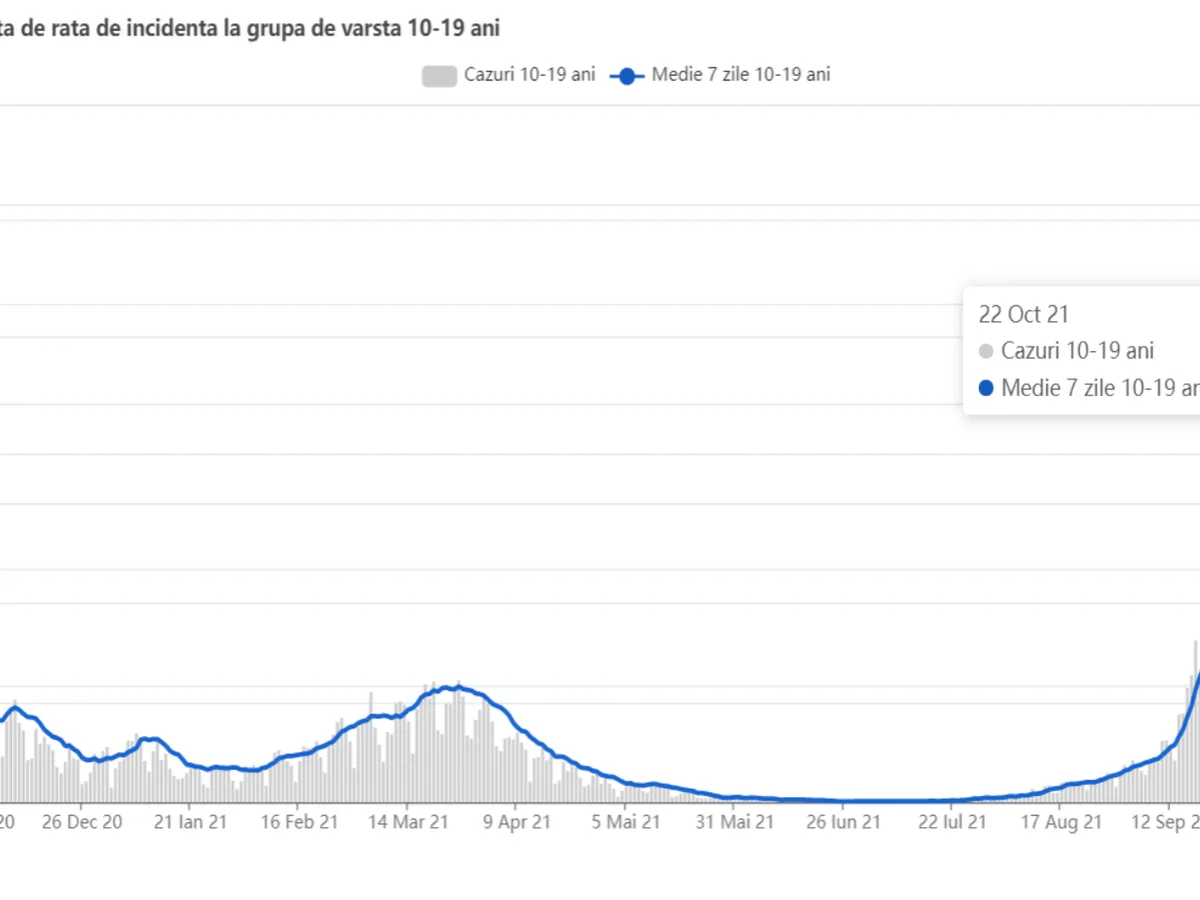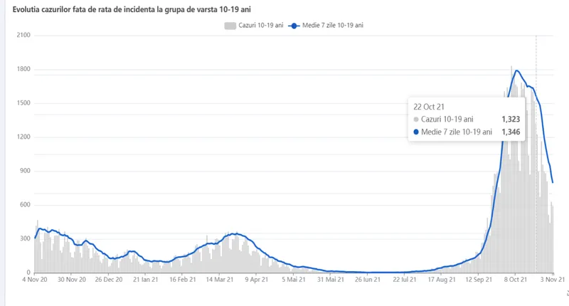 Pe 22 octombrie au fost 1323 de cazuri de copii cu vârsta între 10 și 19 ani infectați cu COVID. Pe 3 noiembrie sunt 680 de copii infectați sub vârsta între 10 și 19 ani cu COVID. Scăderea este de 48%.
