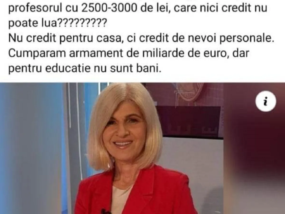 El susține, preluând un text de pe blogul lui Ion Cristoiu, următoarele: „cum să înțeleagă cel bogat, cu n-șpe case pe profesorul cu 2.500 - 3.000 de lei salariu care nici credit nu poate lua??? Nu credit pentru casă, ci credit de nevoi personale. Cumpărăm armament cu miliarde de euro, dar pentru educație nu sunt bani”.