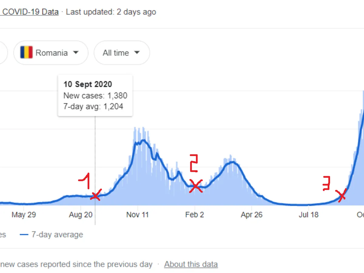 În acea zi s-au înregistrat 1.380 de cazuri noi de COVID. Ne aflam de o lună pe un platou al infecțiilor de puțin peste 1.000 de cazuri zilnice. După începerea școlilor am asistat la o creștere bruscă a infectărilor. Creșterea infectărilor nu a putut fi oprită decât după închiderea școlilor din data de 8 noiembrie.
