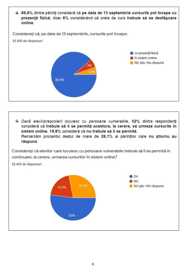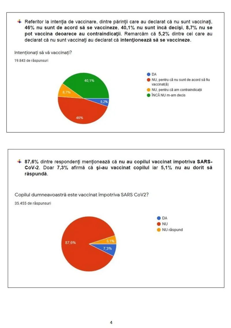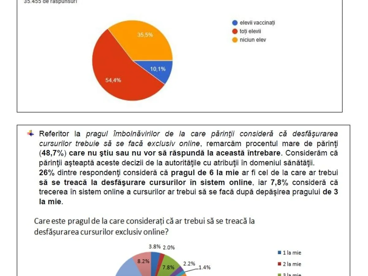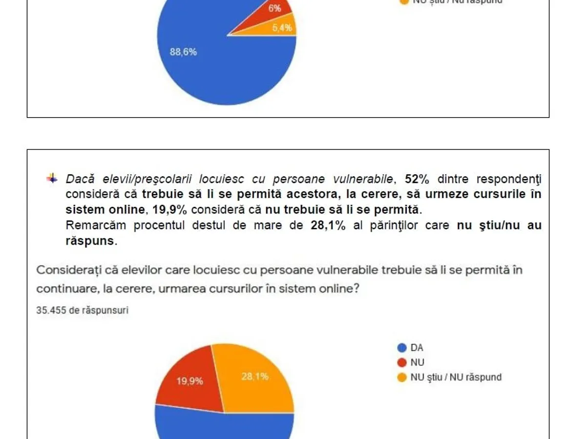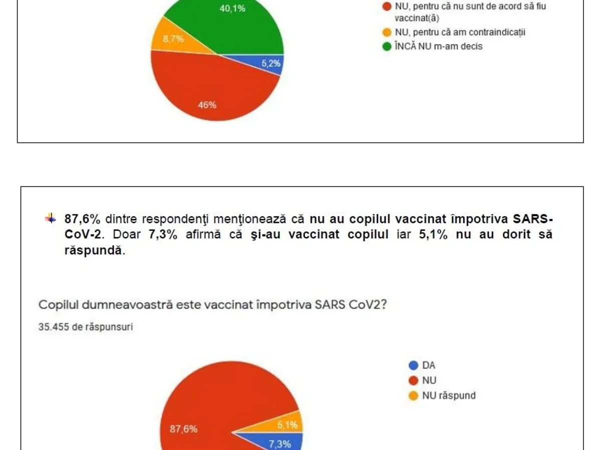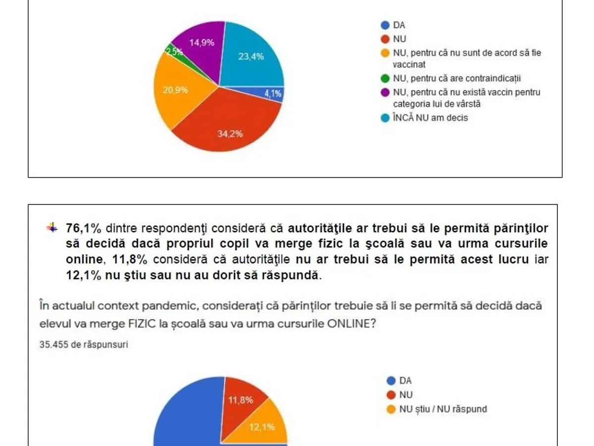 Un sondaj la care au participat peste 35.000 de părinți arată că intenția de vaccinare este mică, atât în rândurilor celor mari, dar și a copiilor. Totuși, 88% vor începerea școlilor în format fizic.