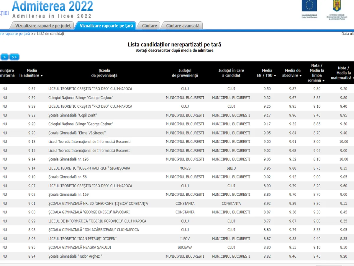 Astăzi, s-au anunțat și rezultatele repartizării computerizate. 110.035 de candidați au fost repartizați în prima etapă de admitere la liceu 2022, iar 6852 nu au fost repartizați, urmând să intre în etapa a doua. La nivel național au rămas 4.993 de locuri neocupate, potrivit datelor centralizate de Ministerul Educației.