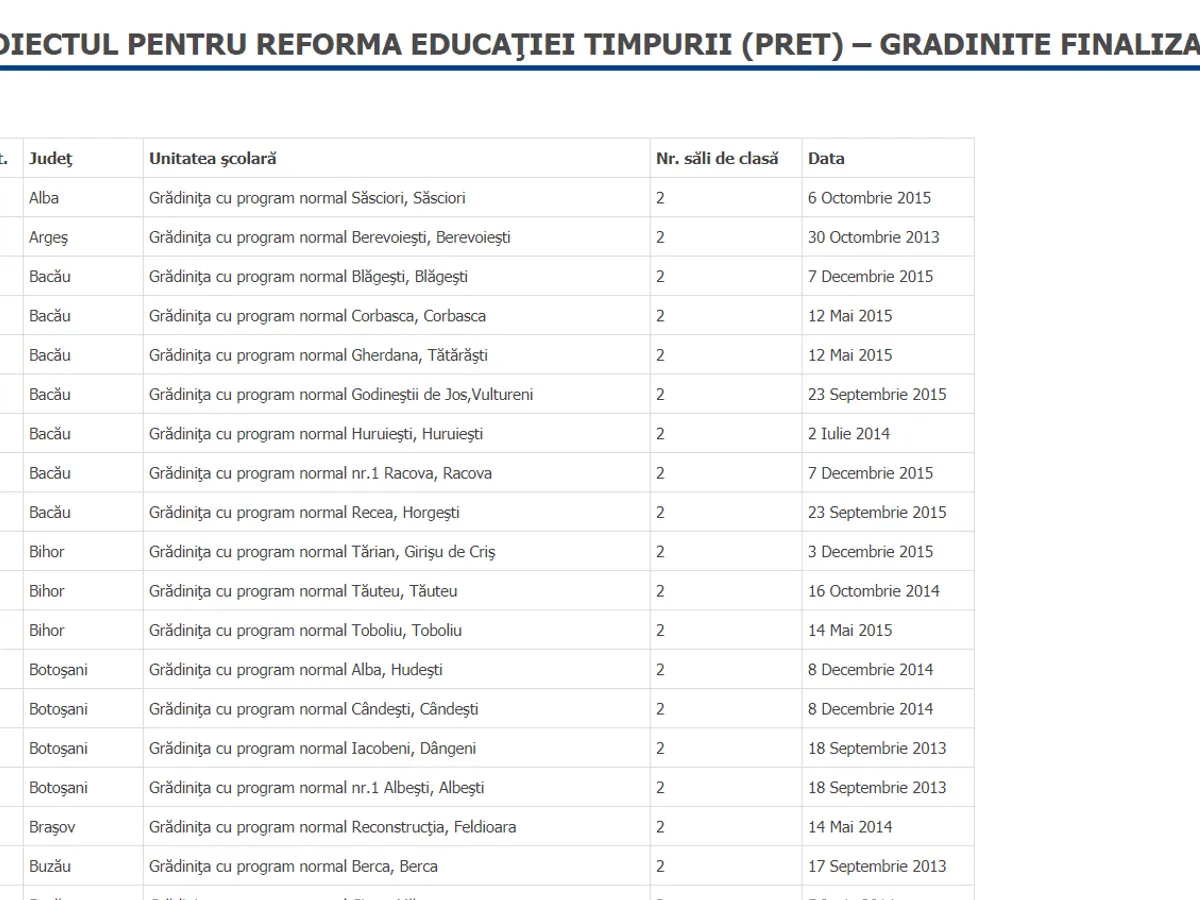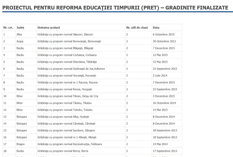 3. Pe siteul Ministerului Educației care urmărește implementarea „Proiectului privind Reforma Educaţiei Timpurii (PRET)”, datele despre construcția și reabilitarea grădinițelor se opresc în 7 decembrie 2015 (cu grădinița din Blăgești). Asta, deși Andronescu vorbește de faptul că s-au finalizat grădinițe și în 2016 și în 2017.