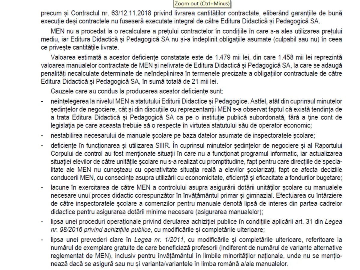 Valoarea estimată a acestor deficiențe constatate este de 1.479 mii lei, din care 1.458 mii lei reprezintă valoarea manualelor contractate de MEN și nelivrate de Editura Didactică și Pedagogică SA”, se arată în document.