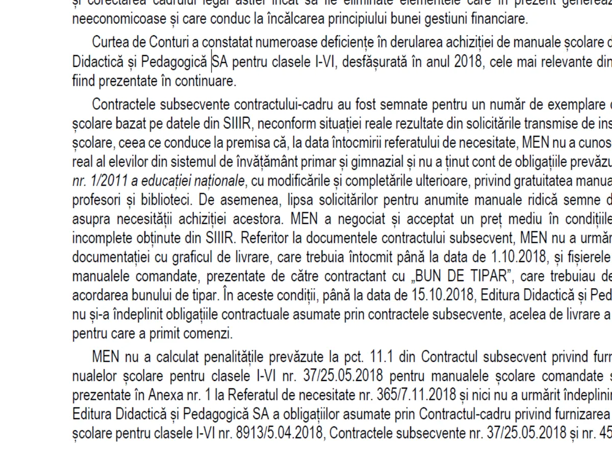 „Curtea de Conturi a constatat numeroase deficiențe în derularea achiziției de manuale școlare de la Editura Didactică și Pedagogică SA pentru clasele I-VI, desfășurată în anul 2018, cele mai relevante dintre acestea fiind prezentate în continuare.
