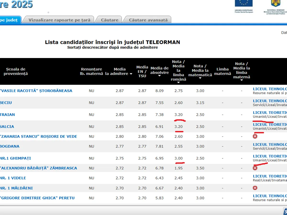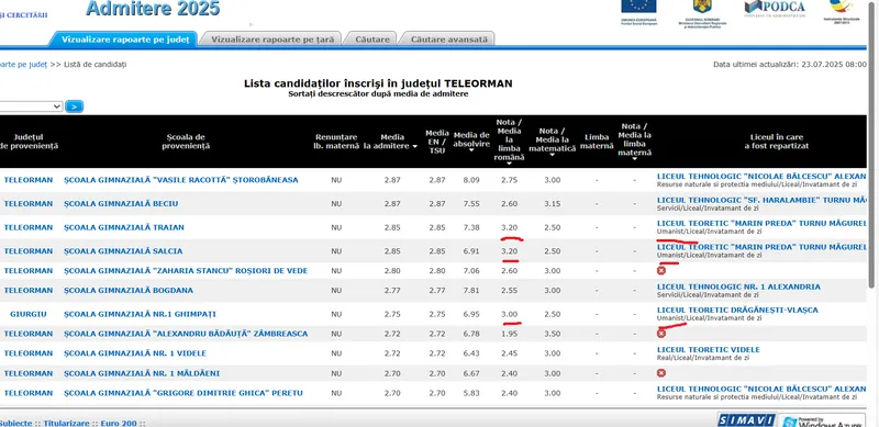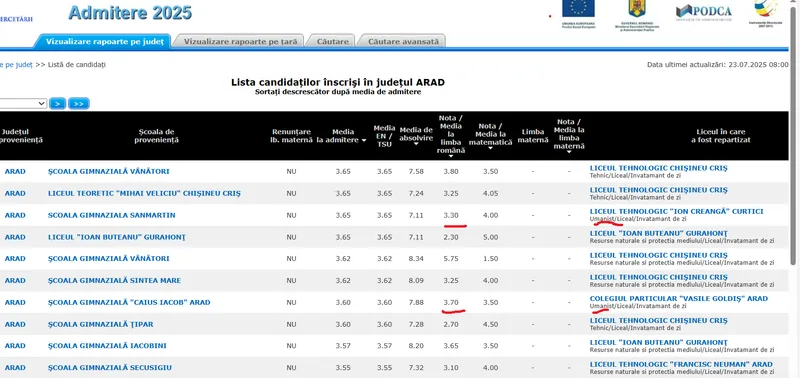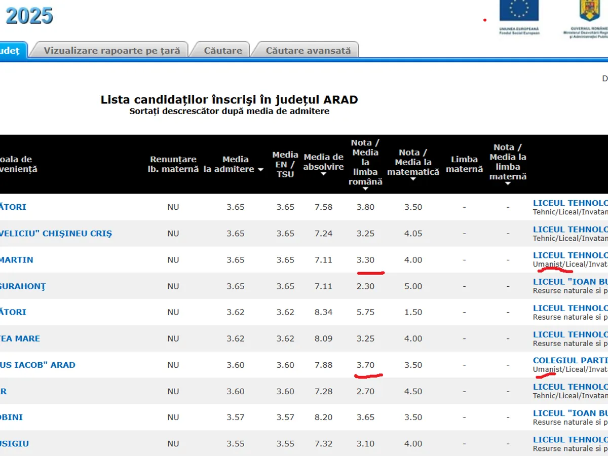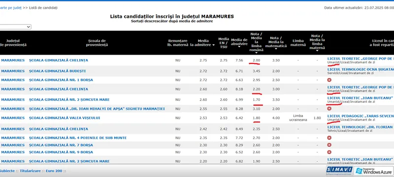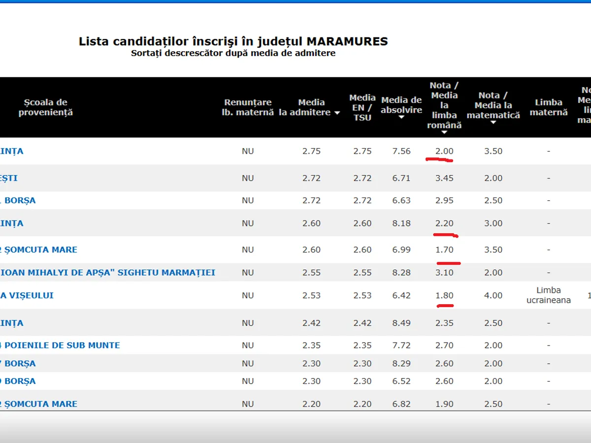 În primul exemplu, avem județul Maramureș. Aici găsim elevi care au luat la examenul de limba română cu note de 2, apoi 2.20 și chiar 1.70 și 1,80. Toți acești elevi au fost repartizați la două licee teoretice diferite, la clase cu profil umanist.