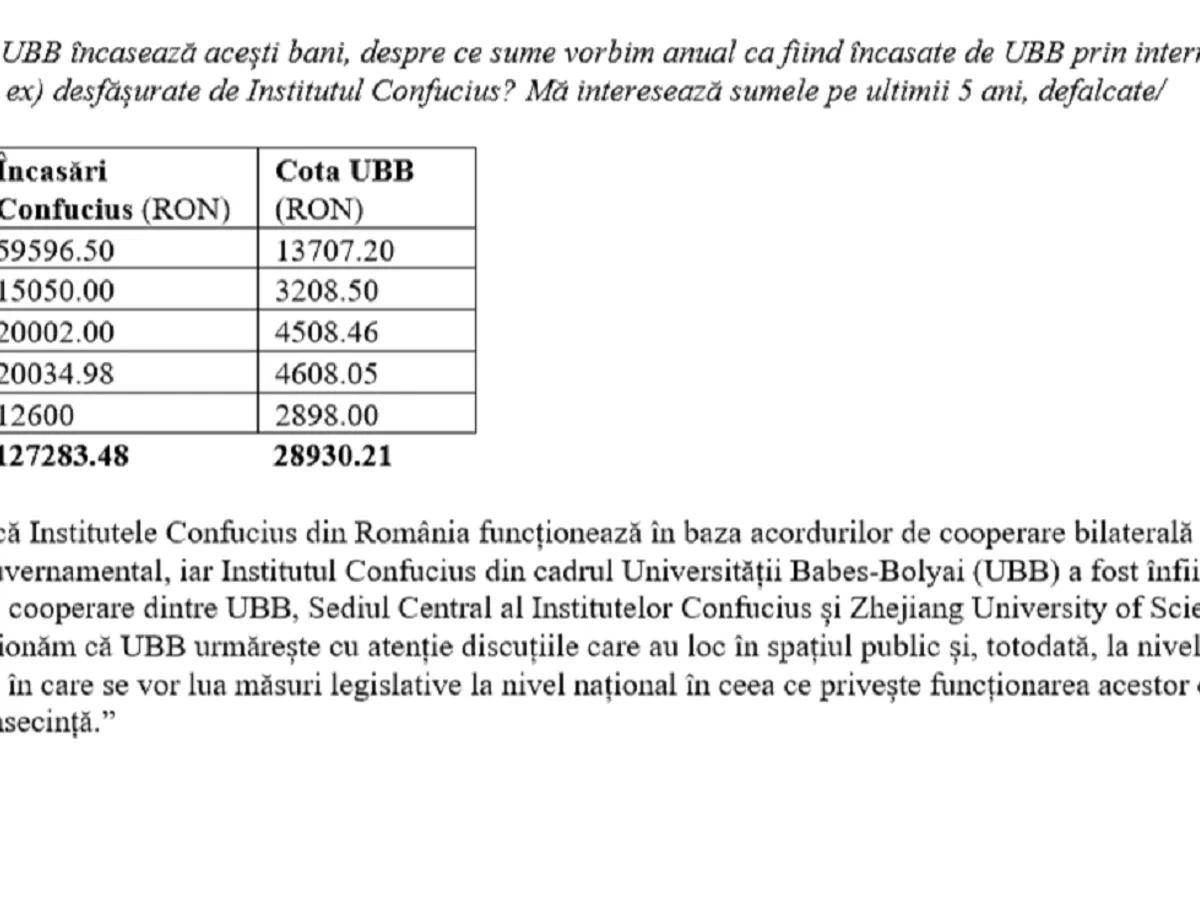 „În baza acordului de înființare a Institutului Confucius în cadrul UBB, s-a stabilit punerea la dispoziția Centrului, de către universitate, în mod gratuit, a unui spațiu de funcționare”, potrivit unui răspuns pentru Newsweek. În ultimii ani, Institutul Confucius a încasat suma de 127.283 de lei din cursuri, cota UBB fiind de numai 28.930 lei.