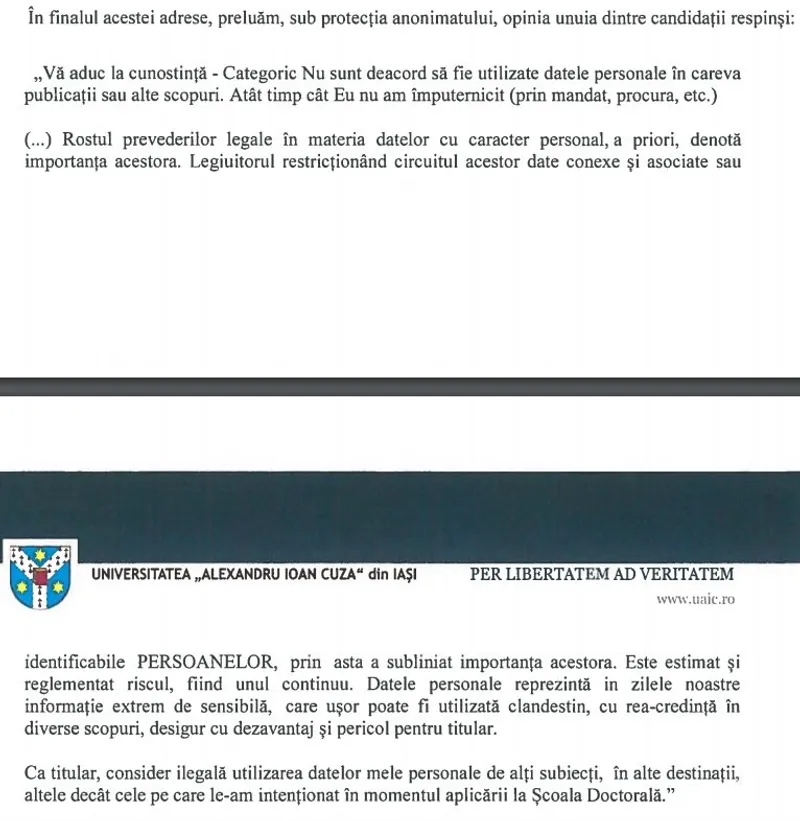 Mențiune: dacă exista aceeași poziție de secretizare față de astfel de date la toate facultățile de la ”Cuza”, nu consideram justificat să facem aceste demersuri. De exemplu, la Universitatea ”Babeș-Bolyai” din Cluj-Napoca aceste informații au fost secretizate pentru toți candidații, de la toate facultățile, prin invocarea GPDR. La Iași însă, unul este hăis, altul cea, iar când am invocat principiul precedentului, în răspuns s-a evitat să se facă referire la acest lucru, comparându-se rezultatele de la doctorat cu cele de la Uniunea Națională a Barourilor și Institutul Național al Magistraturii. De precizat că Facultatea de Drept de la Universitatea București a publicat numele tuturor candidaților la doctorat.
