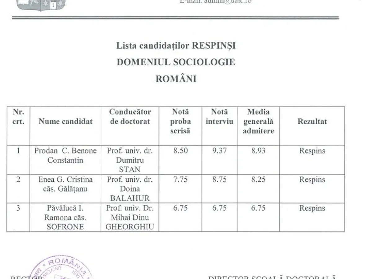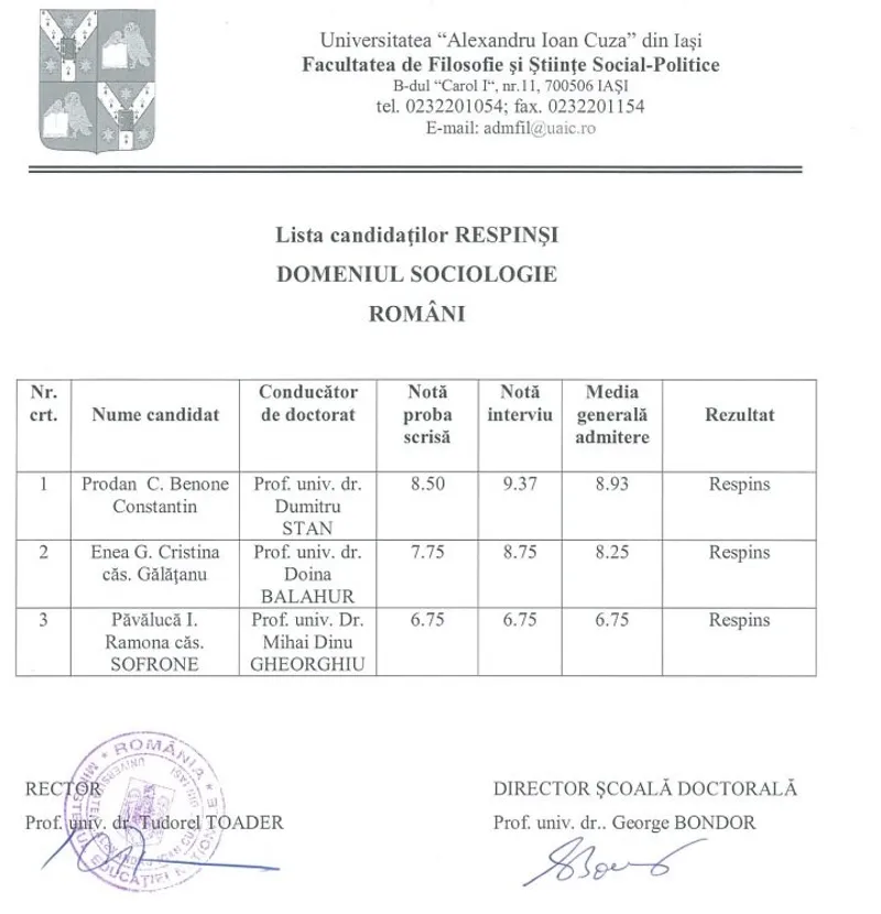 Am revenit cu o altă adresă, cerând și numele celor 19 respinși și reiterând lipsa de echilibru comparativ cu celelalte facultăți (mai jos, listă de respinși la Sociologie, cu nume și prenume, semnată de același Toader), precum și faptul că, în aceeași lună în care a avut loc examenul la doctorat, Facultatea de Drept a pus pe site numele și prenumele tututor candidaților care s-au înscris pentru locuri rămase libere la admitere la licență și master la această facultate.