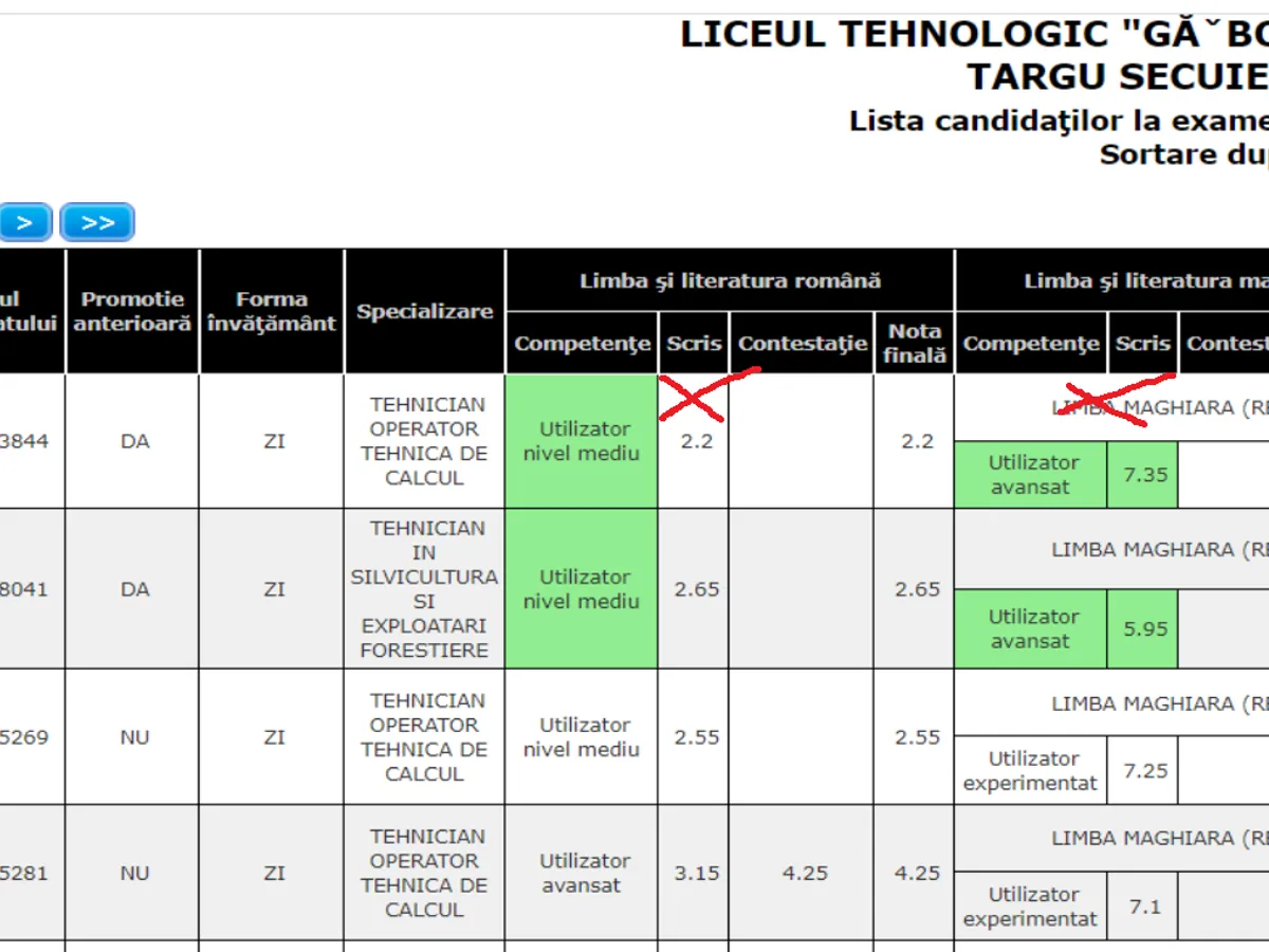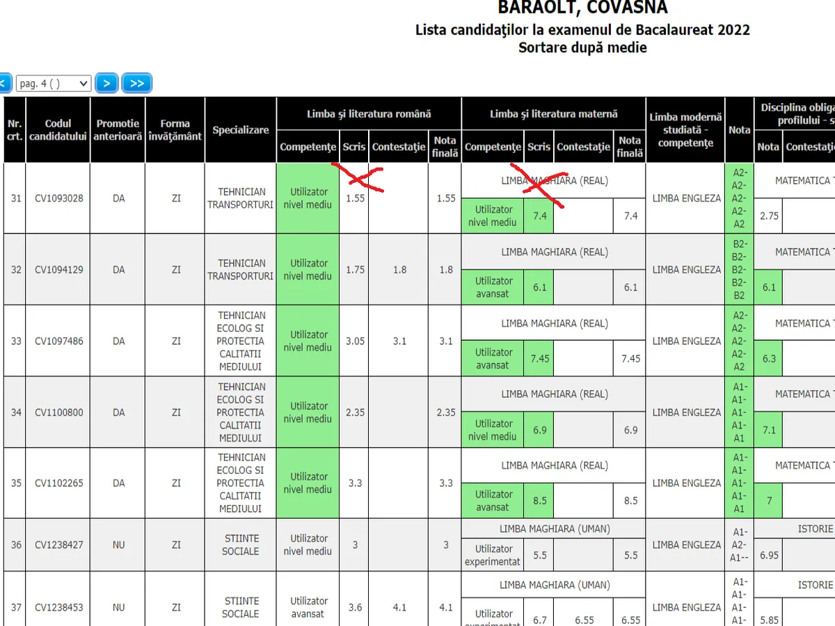 LICEUL TEHNOLOGIC BARÓTI SZABÓ DÁVID BARAOLT, COVASNA, 22 elevi au luat peste 5 la examenul de bacalaureat la limba și literatura română din 72 elevi. A fost o singură notă peste 8. Procent: 30% cu medii peste 5.