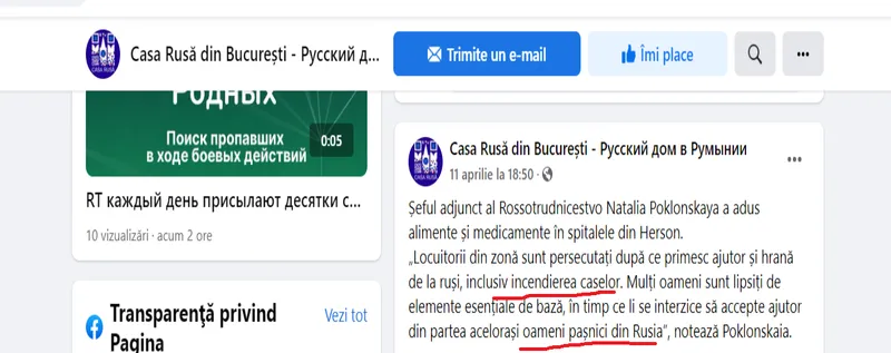 Dacă citiți mai sus veți vedea vedea că nu întâmplător pagina de FB a Casa Rusă a scris că „șeful adjunct al Rossotrudnicestvo Natalia Poklonskaya a adus alimente și medicamente în spitalele din Herson.” Este vorba de șefa agenției care are în subordine Casa Rusă.