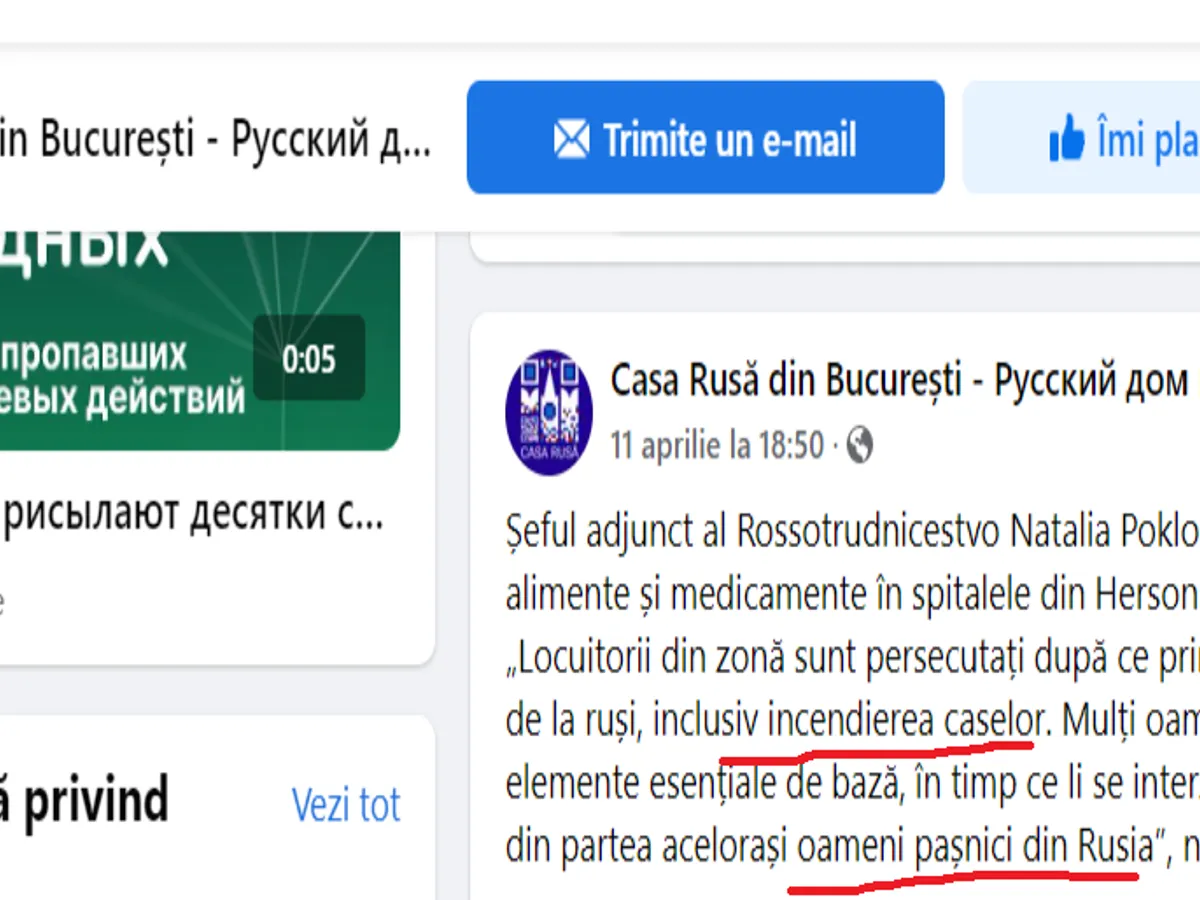 O instituție culturală rusească continuă să funcționeze în București și să propage fake-news în legătură cu războiul din Rusia. Minciunile scrise de Casa Rusă pe pagina de FB despre războiul din Ucraina sunt strecurate printre anunțuri privind organizarea de cursuri.