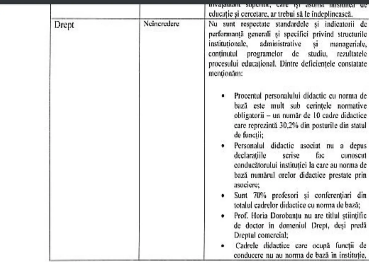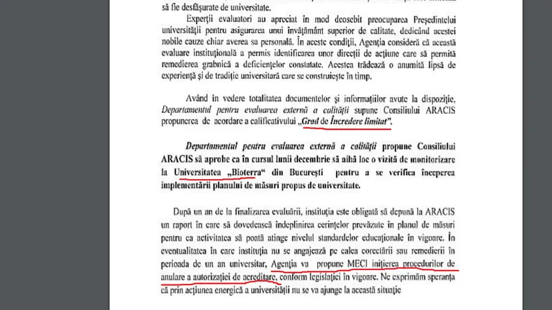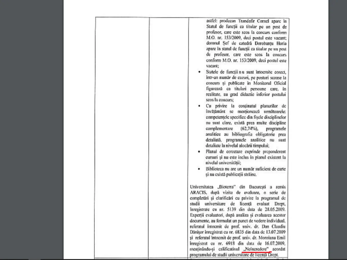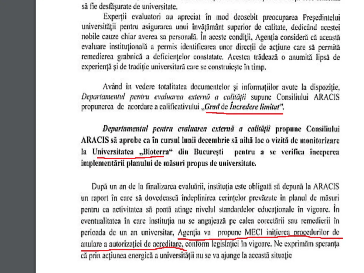 Neregulile descoperite la Universitatea Bioterra (vezi facsimil) care i-au adus calificativul NEÎNCREDERE