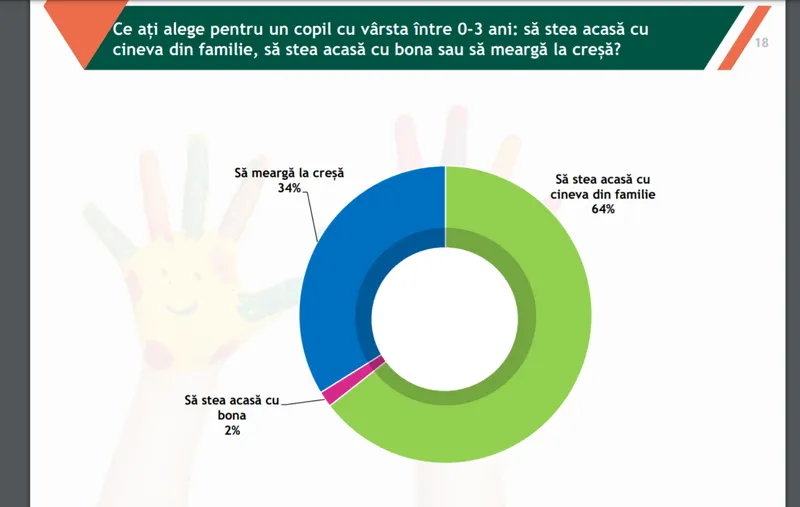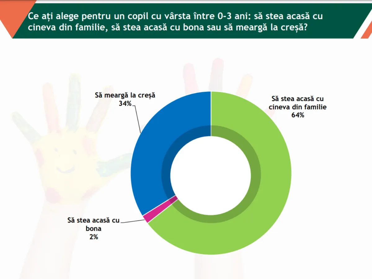 Pentru copiii cu vârsta de până la 3 ani, așteptarea largă a majorității este de sta acasă cu cineva din familie, în timp ce numai o treime preferă creșa în locul familiei.