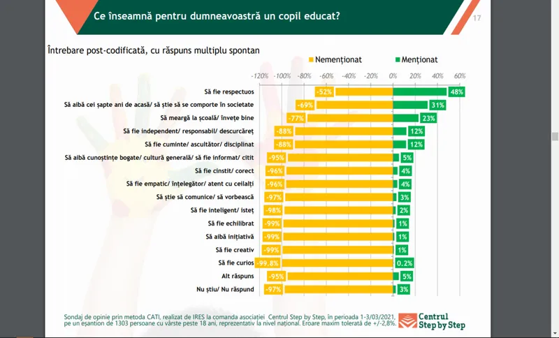• Pentru cei care au copii de vârstă preșcolară, dominantele educației sunt respectul, buna creștere și rezultatele școlare și apoi, independența.