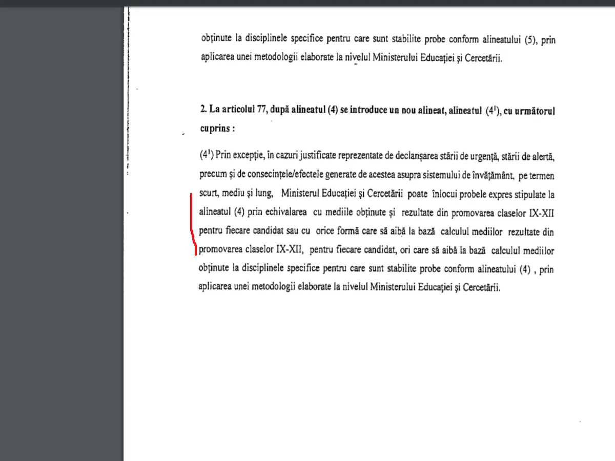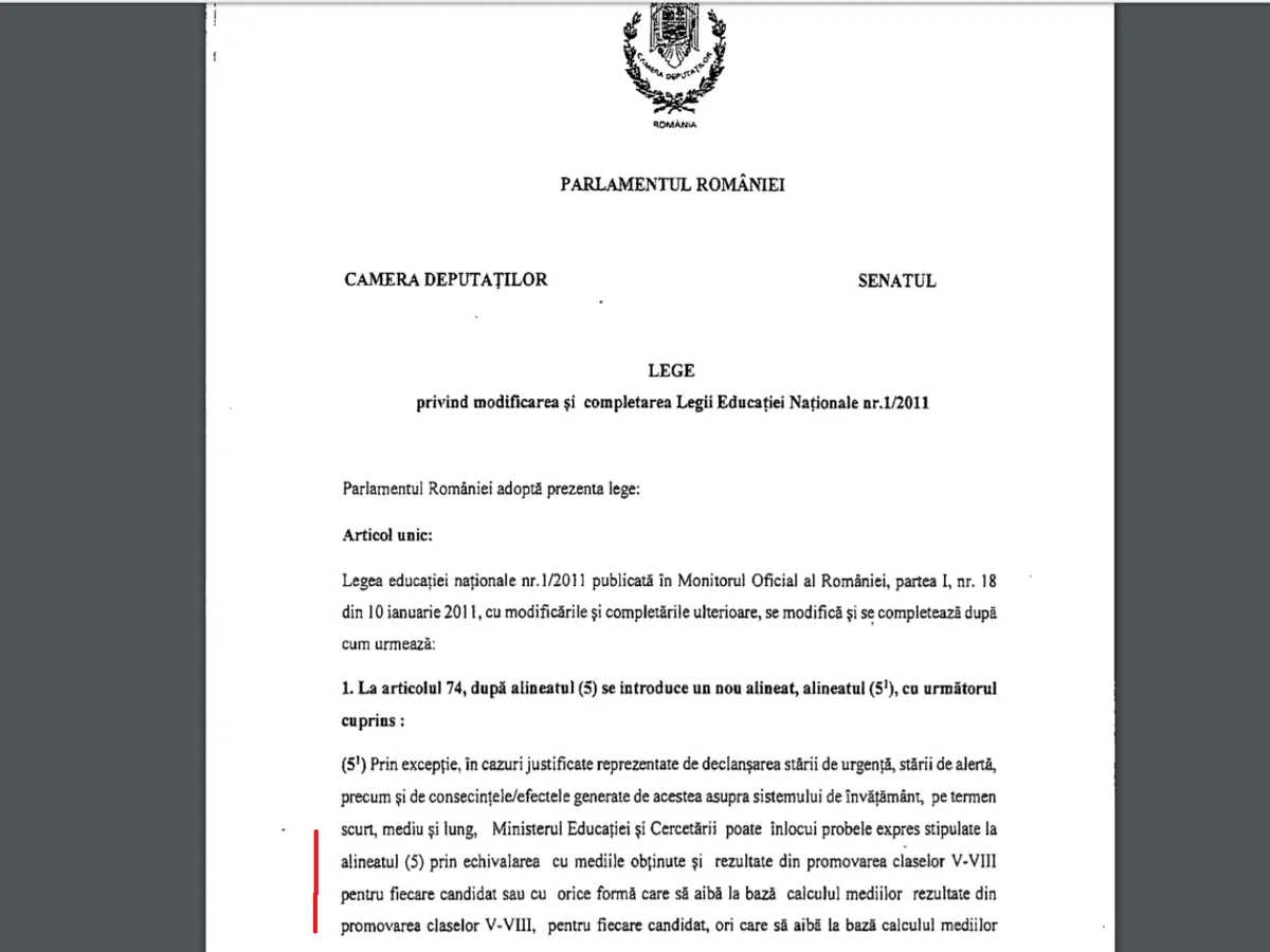 „Prin excepție, în cazuri justificate de declanșarea stării de urgență, stării de alertă, precum și de consecințele/efefctele generate de acestea asupra sistemului de învățământ... Ministerul Educației poate înlocui probele (de la Evaluarea Națională n.red.) prin echivalarea cu mediile obținute și rezultate din promovarea claselor V-VII pentru fiecare candidat sau orice formă care să aibă la bază calculul mediilor rezultate din promovarea claselor V-VIII, ori care să aibă la bază calculul mediilor obținute la disciplinele specifice...”