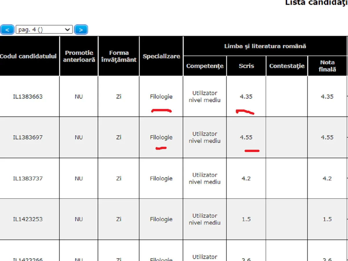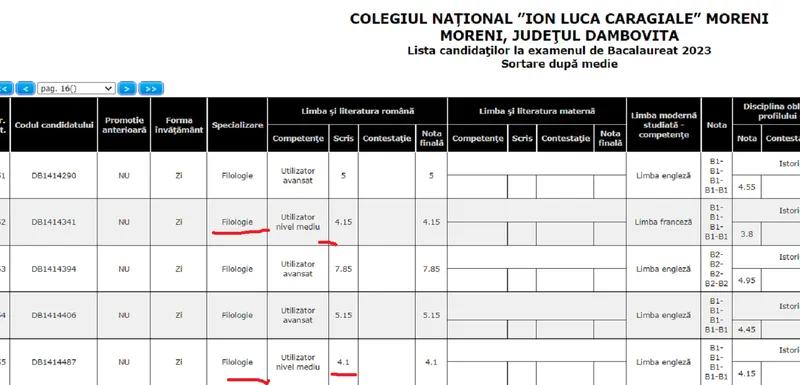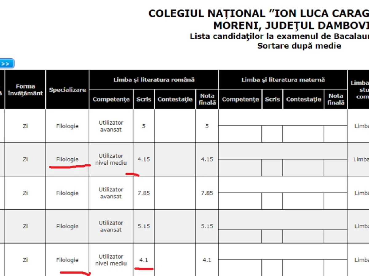 Și la Colegiile Naționale, unde se atrange „elita” școlară, avem elevi de la clase de filologie care nu au luat 5 la română. Spre exemplu, la Colegiul Național „Caragiale” din Moreni, după cum se vede din tabelul de mai jos.