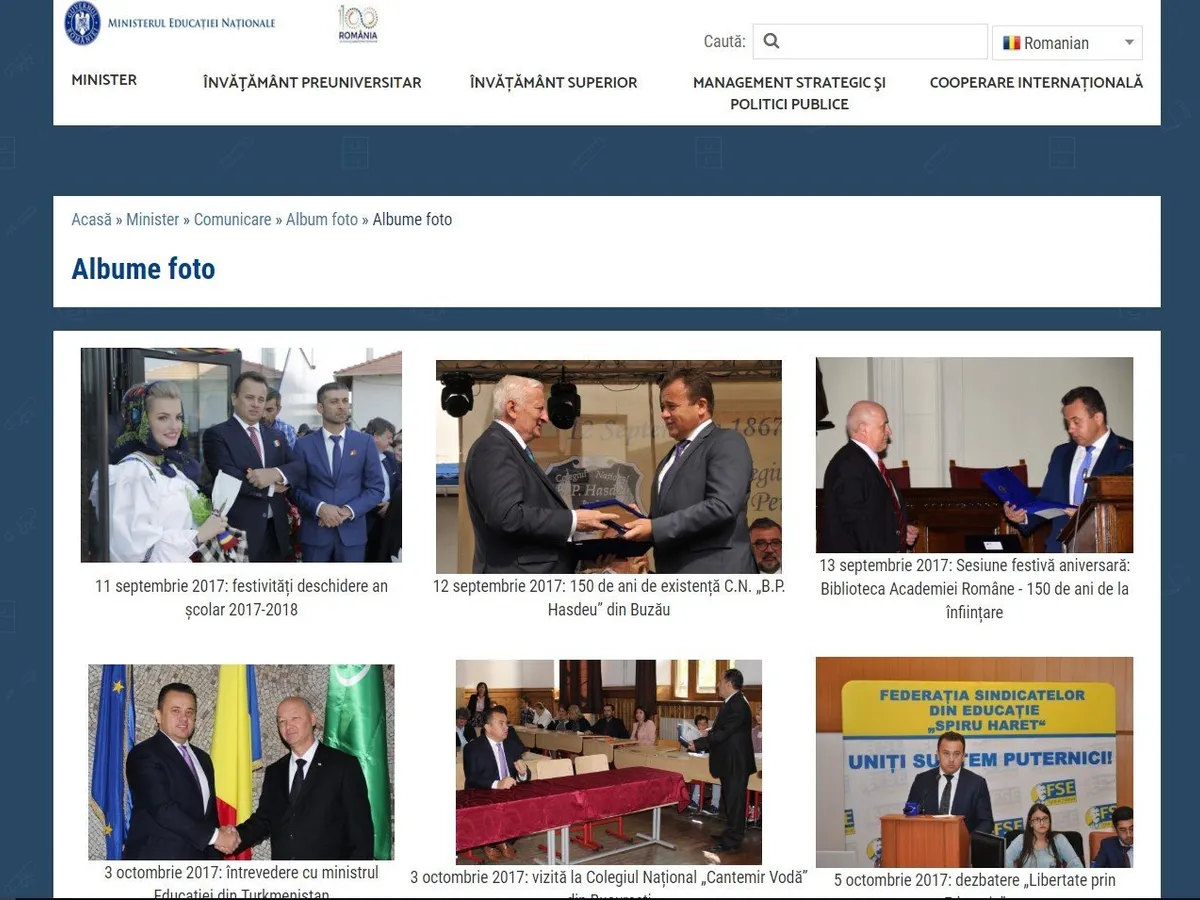 Și asta pentru că, nu vor mai trebui să actualizeze „albumul foto”, unde ultimele imagini postate îl înfățișează pe ministrul Educației Liviu Pop în tot felul de acțiuni din perioada în care era ministru. Pop la „Sesiune festivă aniversară: Biblioteca Academiei Române - 150 de ani de la înființare”. Liviu la „150 de ani de existență C.N. „B.P. Hasdeu” din Buzău”, Liviu la „festivități deschidere an școlar 2017-2018”. De atunci a mai fost ministru Valentin Popa dar el a fost șters de la panoul de onoare online al Ministerului.