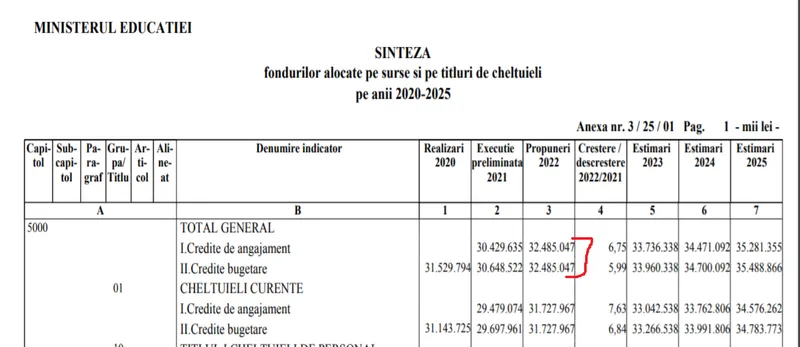Ministerul Educaţiei primeşte, potrivit proiectului de buget publicat de Finanţe, 32,5 miliarde de lei în 2022, în creştere cu 6% faţă de execuţia bugetară preliminară din 2021.