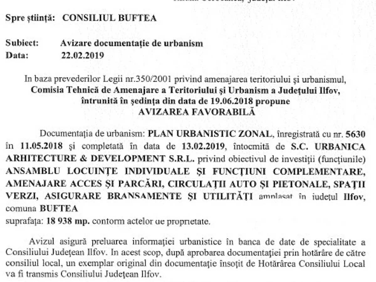 Consiliul Județean Ilfov a decis să avizeze favorabil Planul Urbanistic Local „privind obiectivul de investiții Ansamblu de locuințe individuale și funcțiuni complementare, amenjare acces și parcări, circulații auto și pietonale, spații verzi, asigurare branșamente și utilități amplasat în jdețul Ilfov, comuna Buftea, în suprafață de 18.938 de metri”.