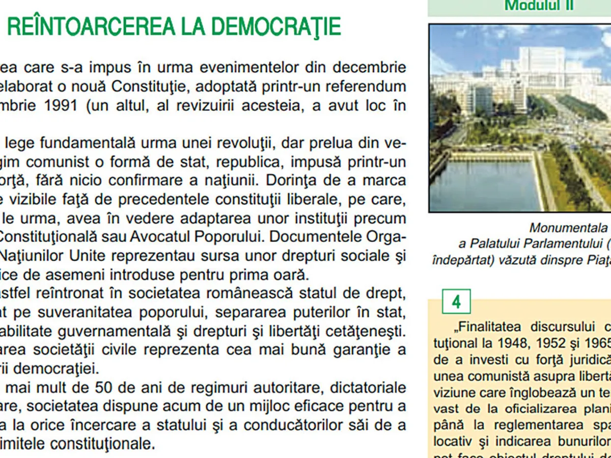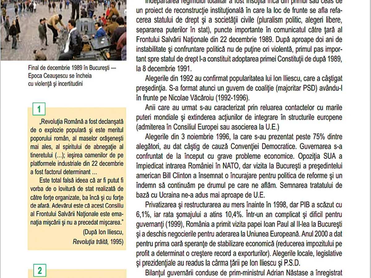 Realizările menționate în manual sunt: adoptarea unei constituții, democratizarea țării și alternanța la putere după alegerile din 1996. Nu se vorbește de rolul pe care l-a avut fostul președinte Iliescu la Revoluție.