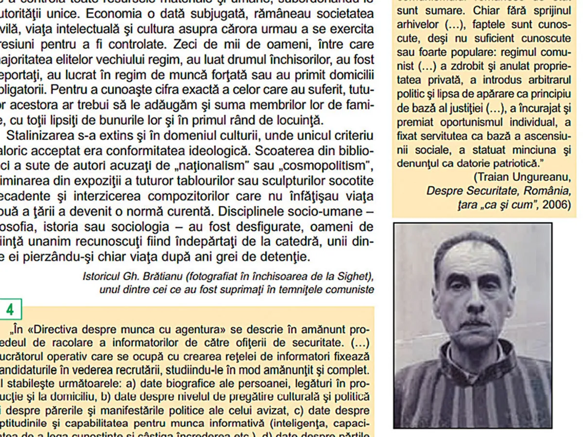 După care, dând pagina manualului, aflăm brusc că: „autoritățile comuniste au eliberat (după 1964 n.red.) mii de deținuți politici și a fost inițiat un vast program de reconsiderare a valorilor naționale, fiind readuși în prim-plan mari oameni de cultură complet ignorați până atunci“.