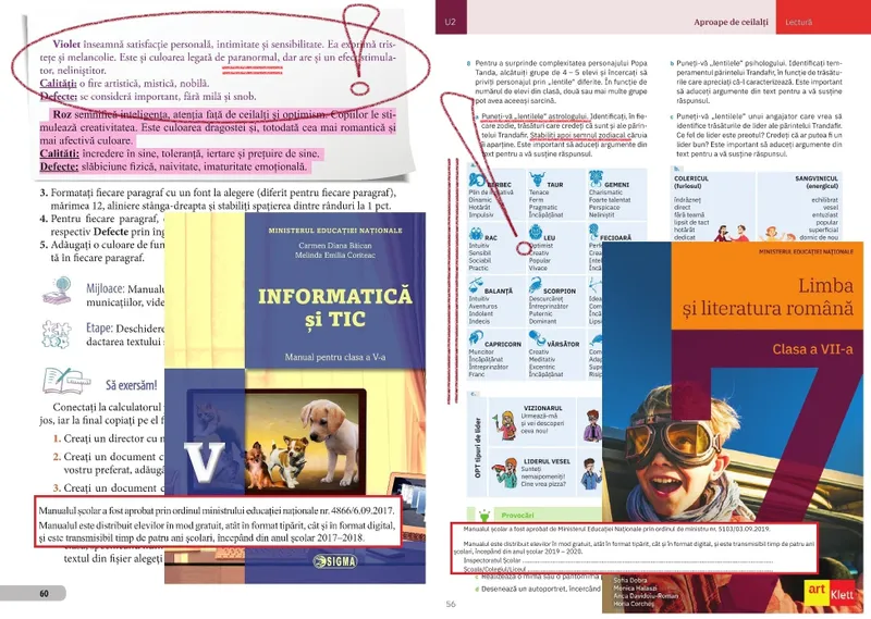 În clasa a VII-a, la Română, copiii au bucuria de a afla caracteristicile fiecărei zodii în parte. Racul este practic, Leul, vivace, iar Scorpionul, dominant. Manualul este aprobat prin ordinul de ministru nr. 5103/03.09.2019.