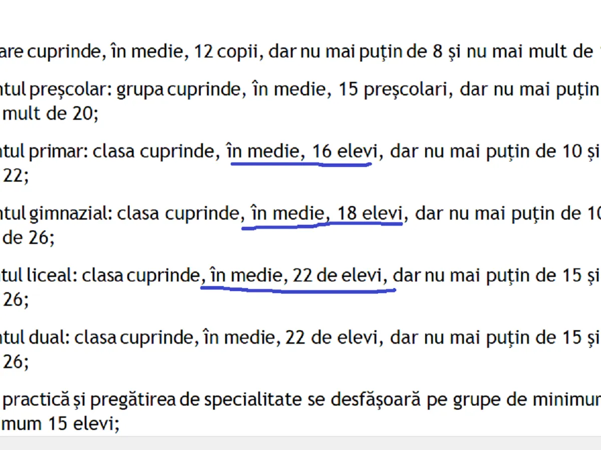 învăţământul primar: clasa cuprinde, în medie, 16 elevi, dar nu mai puţin de 10 şi nu mai mult de 22;