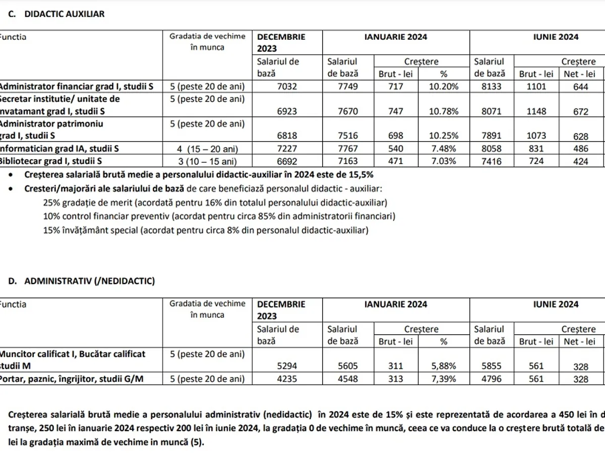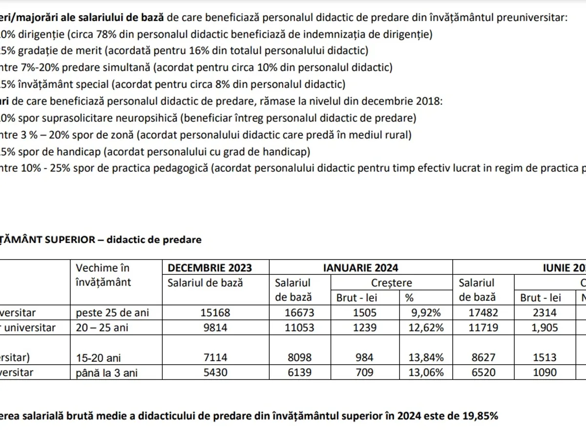 Potrivit acestuia, cele mai mari creșteri sunt pentru funcțiile administrative, atât în mediul academic (19% pentru rectori), cât și în cel preuniversitar (26-28% pentru inspectori și aproape 30% pentru directorii de școli).