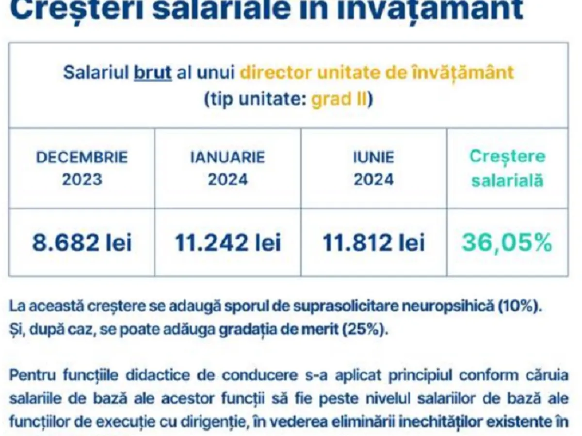 Prin actualul proiect de act normativ, pentru funcțiile de conducere de director în luna ianuarie 2024 este un salariu de bază minim de 10.590 lei și un salariu de bază maxim de 11.242 lei, diferența între acestea fiind de 652 lei, iar în luna iunie 2024 este un salariu de bază minim de 11.260 lei și un salariu de bază maxim de 11.812 lei, diferența între acestea fiind de 552 lei.