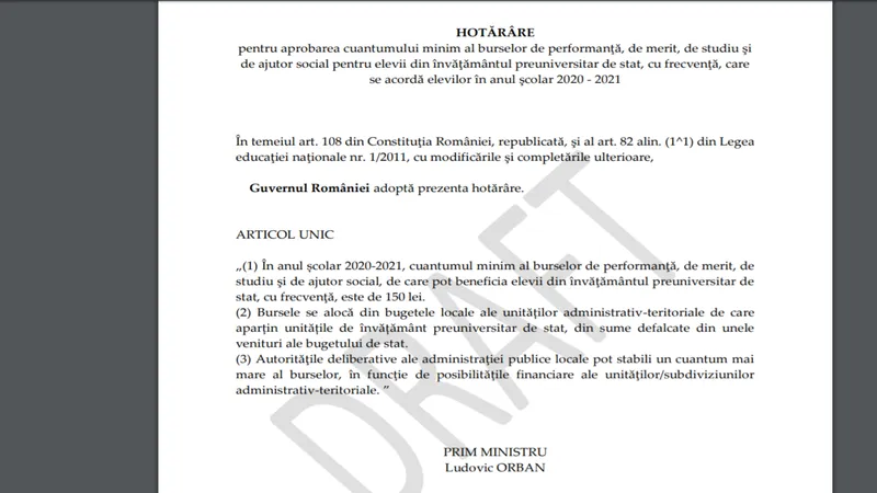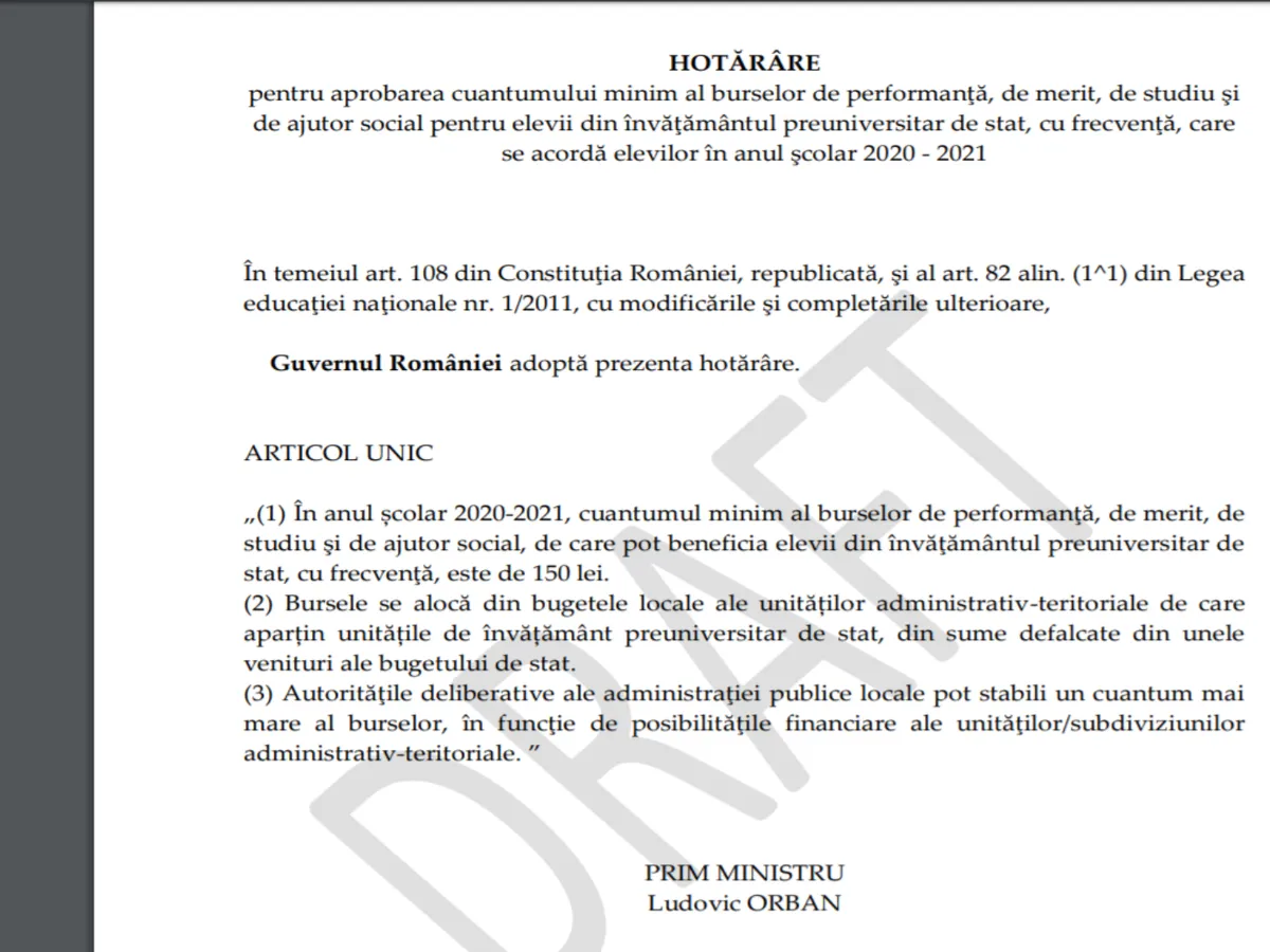 Pobabil și în acest context, a apărut proiectul de Hotărâre pentru aprobarea cuantumului minim al burselor de performanţă, de merit, de studiu şi de ajutor social pentru elevii din învăţământul preuniversitar de stat, cu frecvenţă, care se acordă elevilor în anul şcolar 2020 – 2021.