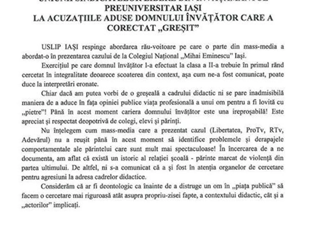 „Chiar dacă am putea vorbi de o greşeală a cadrului didactic, ni se pare inadmisibilă maniera de a aduce în faţa opiniei publice viaţa profesională a unui om pentru a fi lovită cu «pietre»", spun reprezentanţii USLIP Iaşi în comunicatul de presă citat.